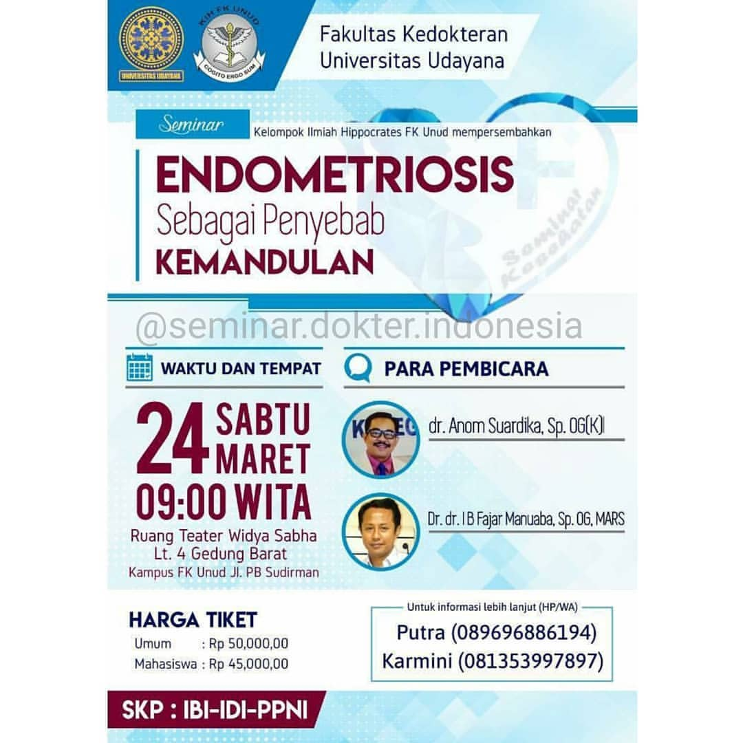 Seminar Endometriosis Sebagai Penyebab Kemandulan dipersembahkan oleh Kelompok Ilmiah Hippocrates FK UNUD. Seminar yang sangat berguna bagi keberlangsungan hidup manusia ini diadakan pada tanggal 24 Maret 2018 pukul 9.00 WITA - Selesai di Kampus FK UNUD.