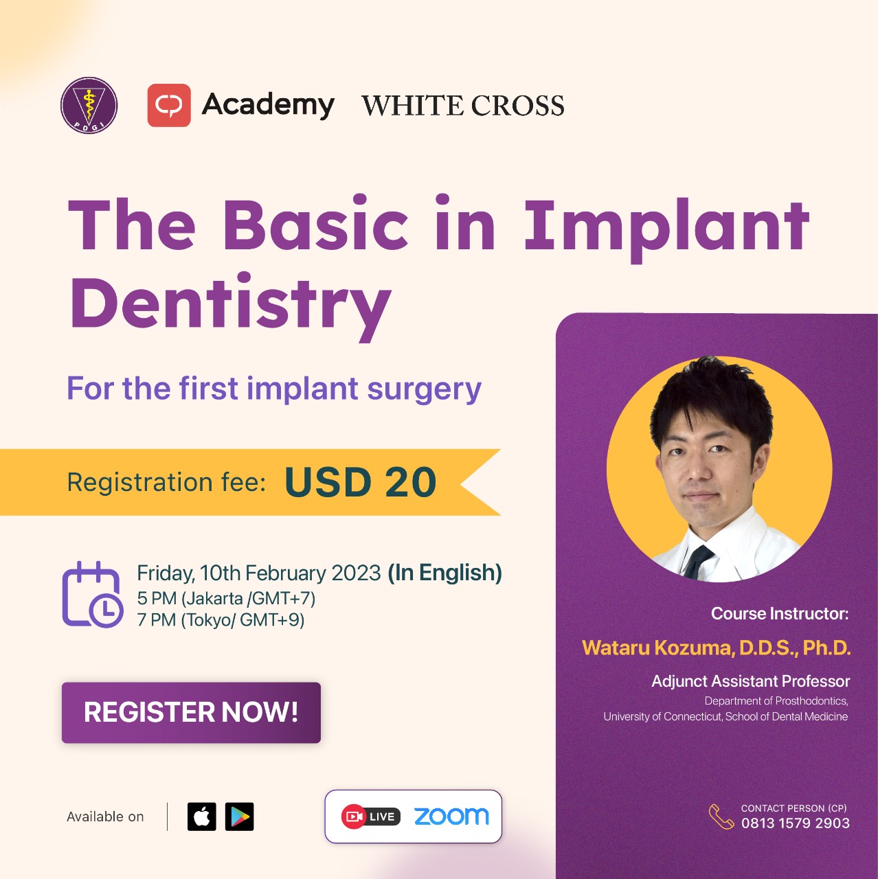 Tingkatkan pengetahuan dan informasi Anda melalui sesi teori online terbaru kami terkait implan gigi bersama Dr. Wataru Kozuma, D.D.S., Ph.D.