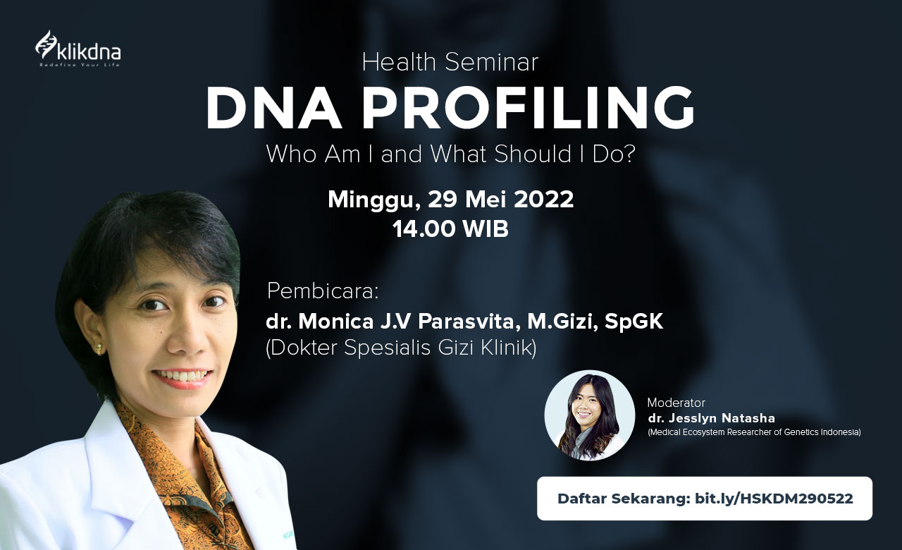 DNA bisa bantu kenali dirimu dan temukan rekomendasi yang paling cocok untuk tubuhmu. Ayo ketahui selengkapnya melalui Health Seminar KlikDNA: