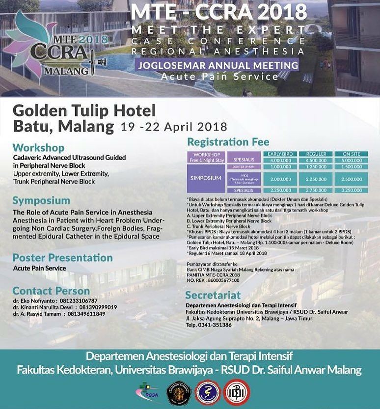 Come and join case conference regional anesthesia 2018 in Golden Tulip Hotel Batu, Malang! Feel free to ask about detail itenerary via contact person number or visit @mteccra instagram page 😊