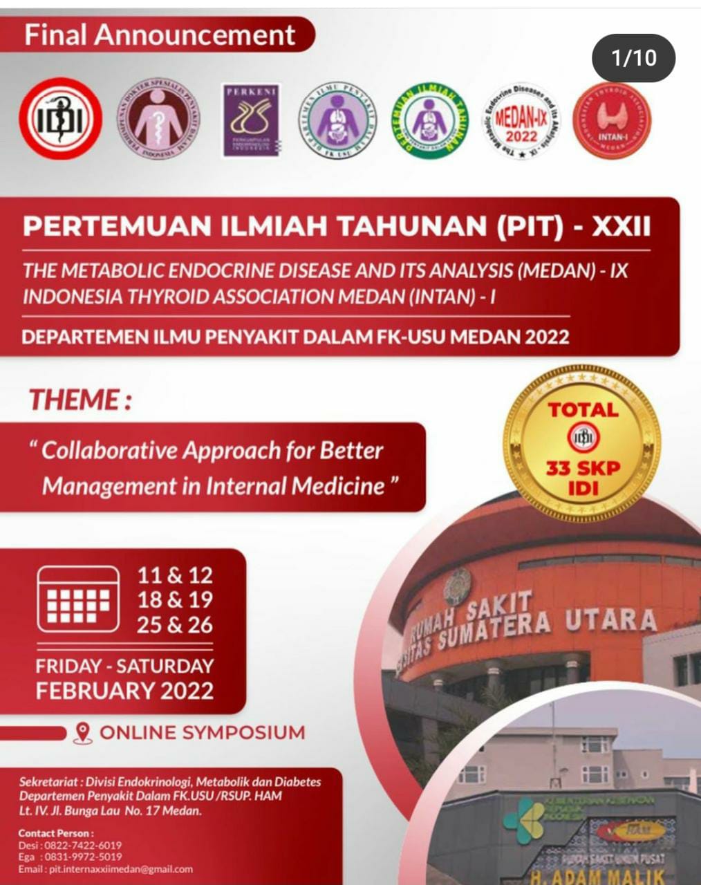 acara Pertemuan Ilmiah Tahunan, PIT XXII Departemen Ilmu Penyakit Dalam Fakultas Kedokteran USU mulai tanggal 11,12,18,19,25 dan 26 Februari 2022 dengan tema “Collaborative Approach for Better Management in Internal Medicine”.