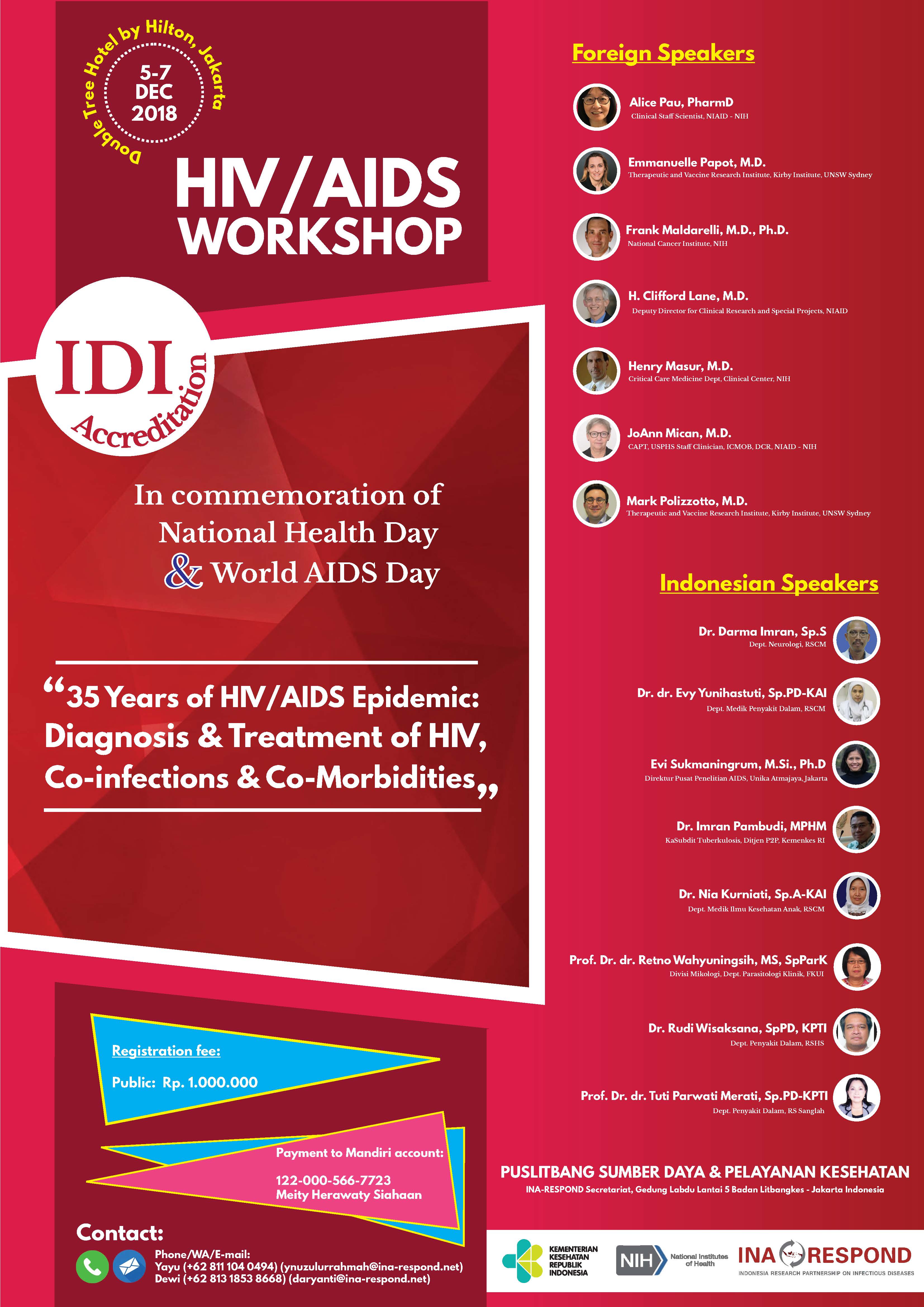 Perkembangan pengetahuan dalam HIV/AIDS dalam beberapa tahun belakangan terus mengalami evolusi, terutama di bidang tatalaksana penyakit HIV/AIDS. Supaya tidak ketinggalan informasinya, kami mengundang Bpk/Ibu/sdr/I semua yang mempunyai ketertarikan terhadap Penyakit HIV/AIDS termasuk kemajuan diagnosis, tatalaksana pengobatan, dan juga komorbid yang menyertai HIV/AIDS dalam suatu workshop HIv/AIDS di bulan Desember dengan tema “35 YEARS OF HIV/AIDS EPIDEMIC: DIAGNOSIS & TREATMENT OF HIV, CO-INFECTIONS & CO-MORBIDITIES”, yang menghadirkan pakar-pakar di bidang HIV/AIDS nasional dan internasional. Info lebih lanjut bisa menghubungi Tim Sekretariat INA-RESPOND di bawah ini :