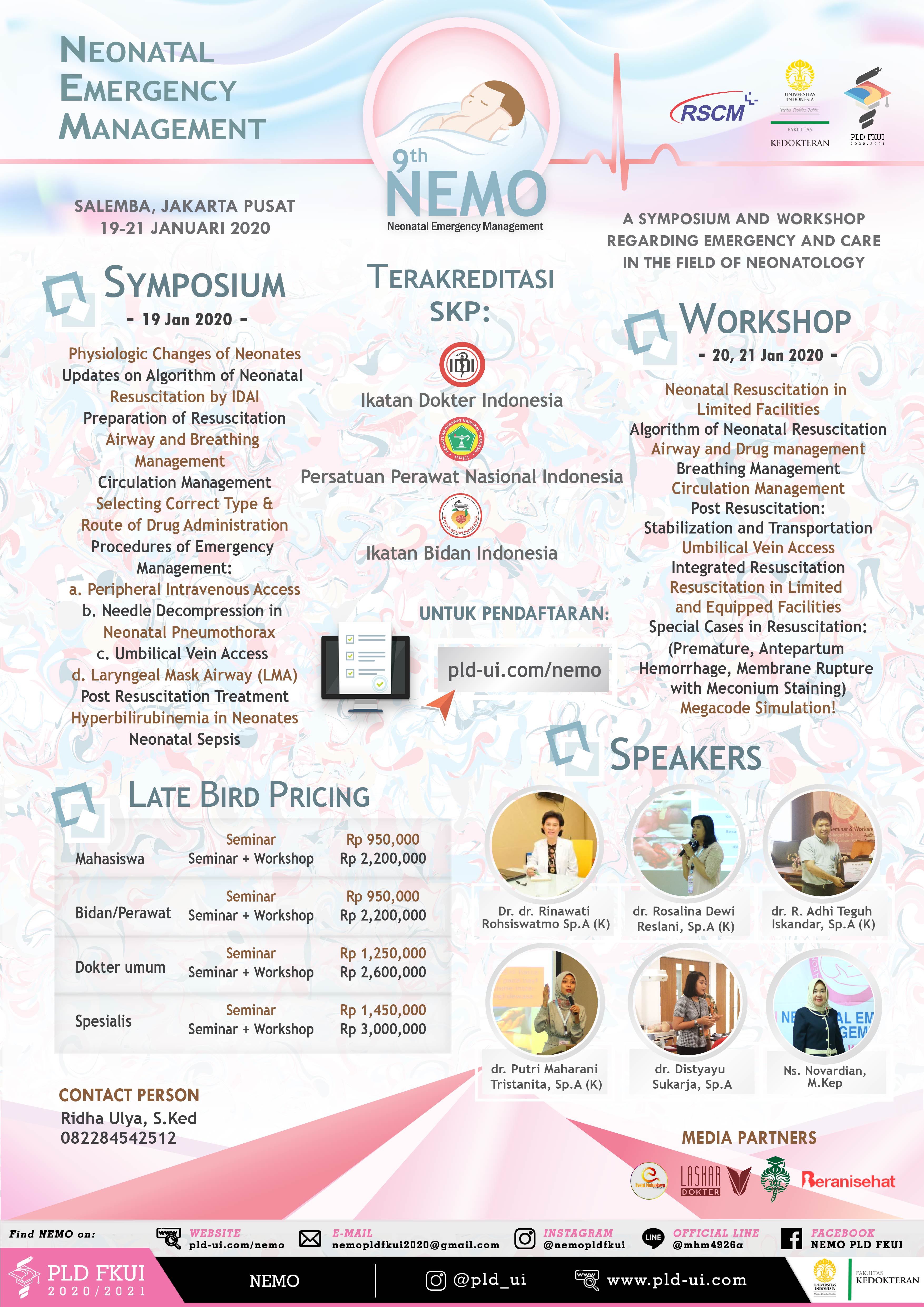 Join the 9th NEMO, an annual event that brings important topics regarding emergency management in neonates. Our symposium and workshop are held in 19th - 21st January 2020 and open for general practitioners, pediatricians, midwives, nurses, and medical students.