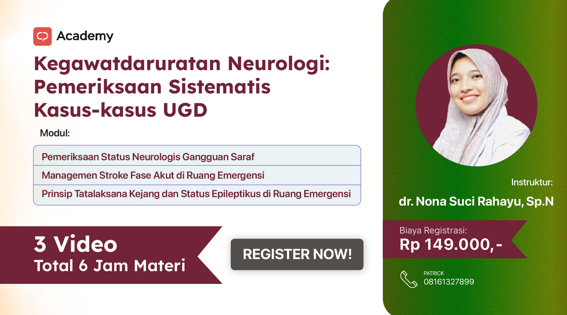 Ikuti kelas online "Kegawatdaruratan Neurologi: Pemeriksaan Sistematis Kasus-kasus UGD" bersama dr. Nona Suci Rahayu, Sp.N