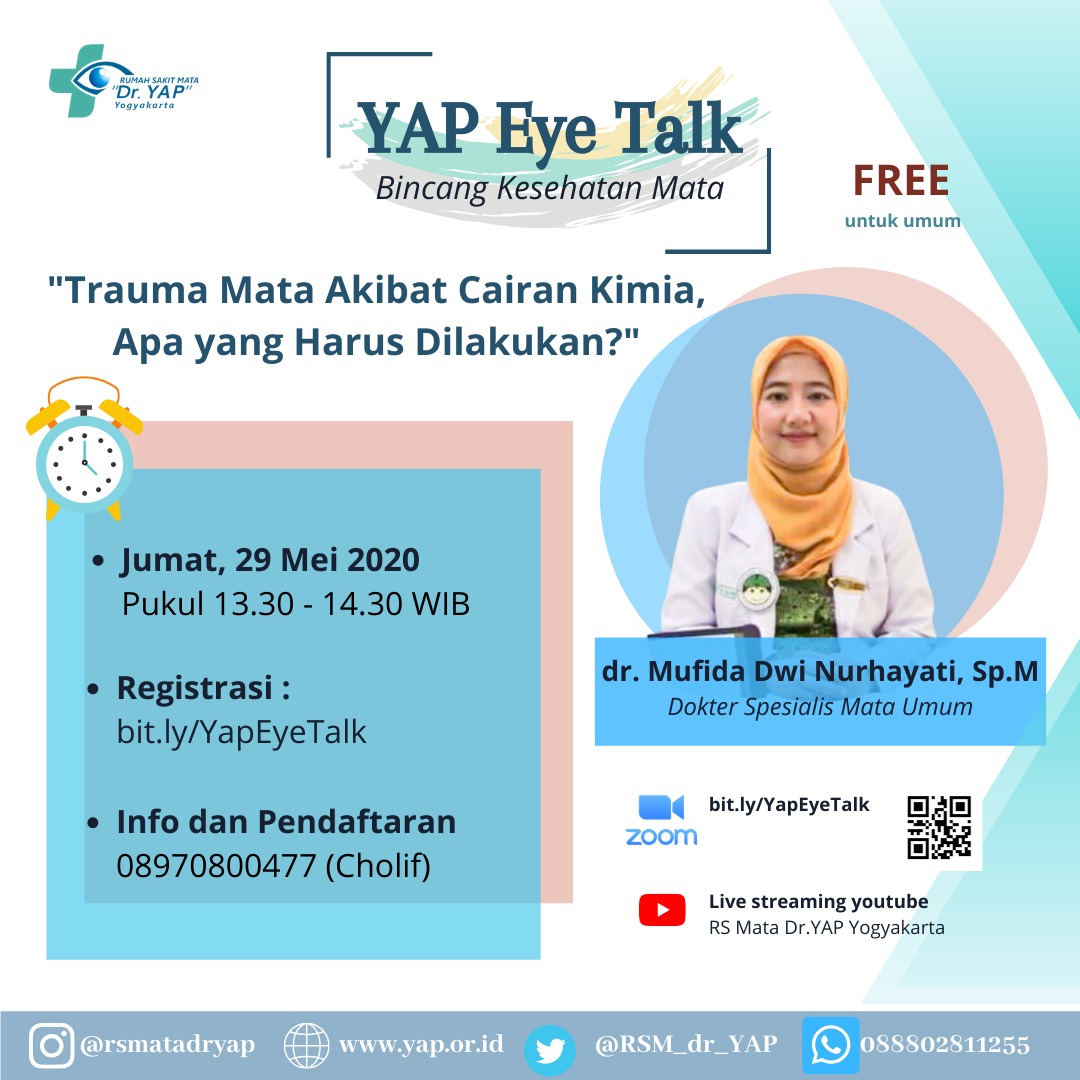 RS Mata "Dr.YAP" akan mengadakan bincang kesehatan mata "YAP Eye Talk" dengan topik Trauma Mata Akibat Cairan Kimia, Apa yang Harus Dilakukan?. Kegiatan tersebut akan dilaksanakan pada :