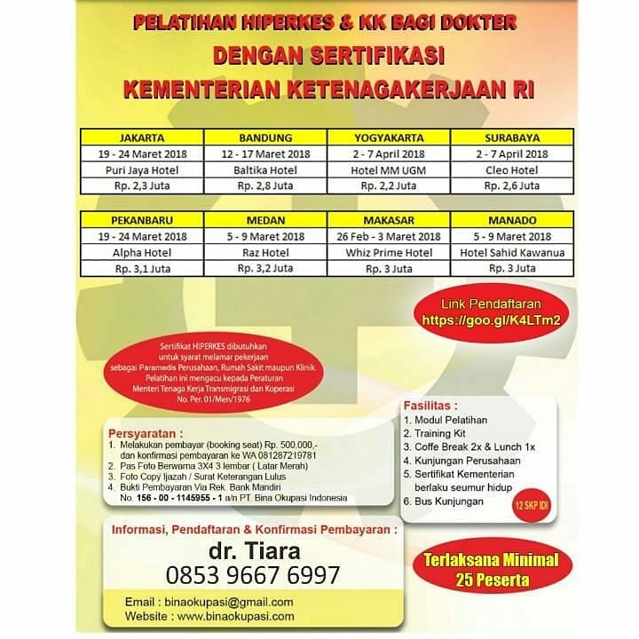 Pelatihan Hiperkes kini tdk perlu lagi membuang biaya utk tiket pesawat dan penginapan ke Jkt, karena pelatihan Hiperkes sdh hadir di beberapa kota. Daftarkan diri segera di kotamu. Jangan lupa ajak teman2 yg lain.