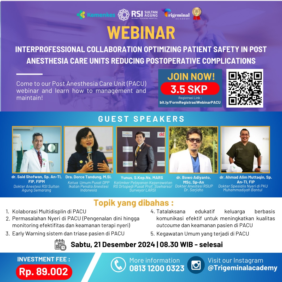 Melalui seminar ini, peserta diharapkan dapat memahami pentingnya kolaborasi antar profesi dalam manajemen optimal di PACU. Seminar ini akan membahas berbagai aspek kolaborasi, mulai dari strategi komunikasi efektif, peran dan tanggung jawab setiap profesi, hingga penerapan protokol klinis berbasis bukti untuk meminimalkan risiko komplikasi. Seminar ini juga akan memberikan wawasan tentang teknologi terbaru yang dapat mendukung manajemen pasien di PACU serta berbagai studi kasus yang menunjukkan keberhasilan pendekatan multidisiplin di lapangan