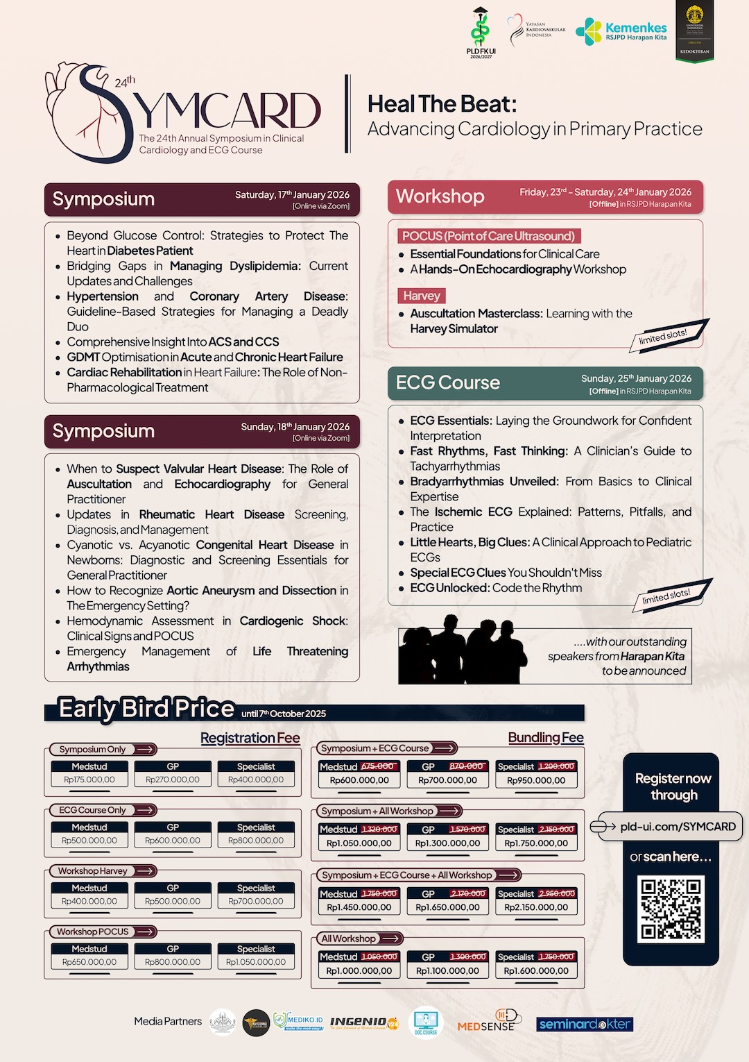 The 24th SYMCARD kembali hadir sebagai bagian dari Seminar Pelantikan Lulusan Dokter UI 26/27, berkolaborasi dengan Departemen Kardiologi & Kedokteran Vaskular FKUI dan Pusat Jantung Nasional Harapan Kita, serta menyediakan SKP resmi bagi peserta.