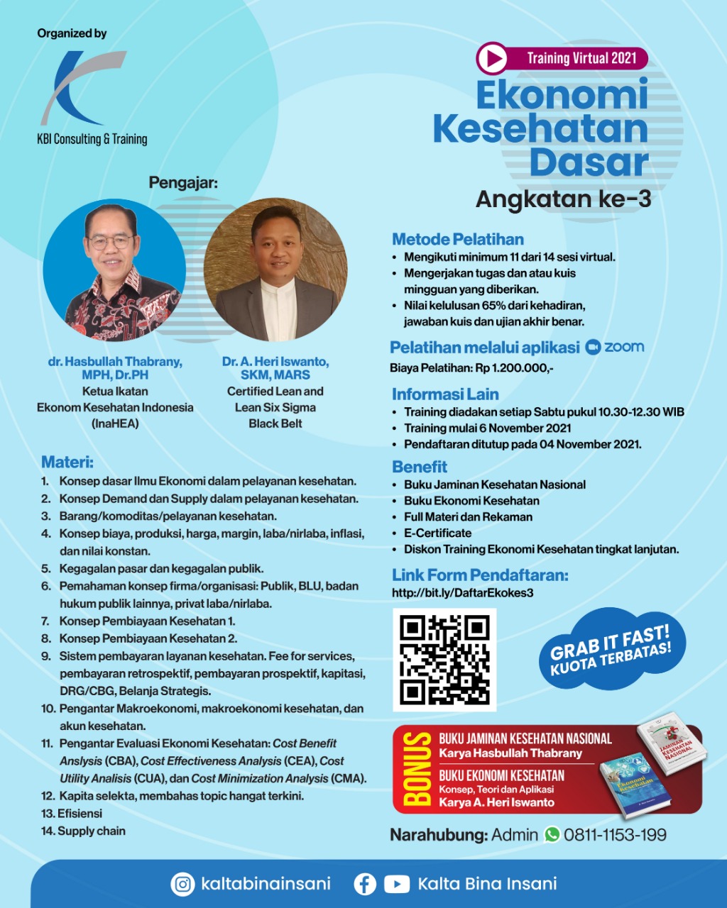 Training ini akan membahas tentang Konsep dasar Ilmu Ekonomi Kesehatan dalam pelayanan kesehatan, konsep biaya, produksi, nilai konstan, pembiayaan kesehatan, sistem pembayaran layanan kesehatan (fee for service, retrospektif, prospektif, kapitasi, DRG/CBG, belanja strategis), dan evaluasi ekonomi kesehatan serta kapita selekta ekonomi kesehatan.