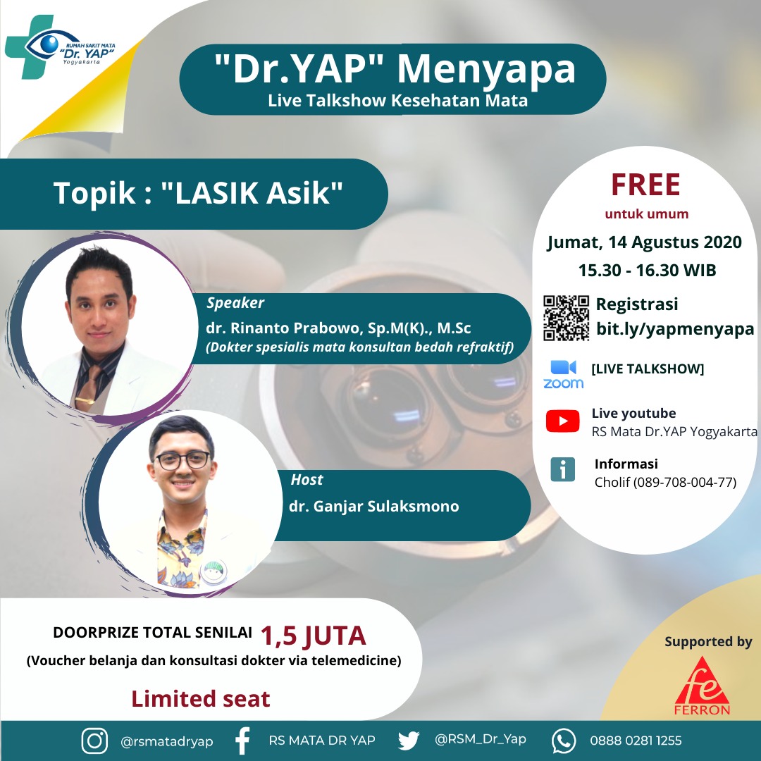 RS Mata "Dr.YAP" akan mengadakan Talkshow Online Kesehatan Mata "Dr. YAP" Menyapa dengan topik LASIK ASIK yang akan mengupas tuntas tindakan Lasik pada mata