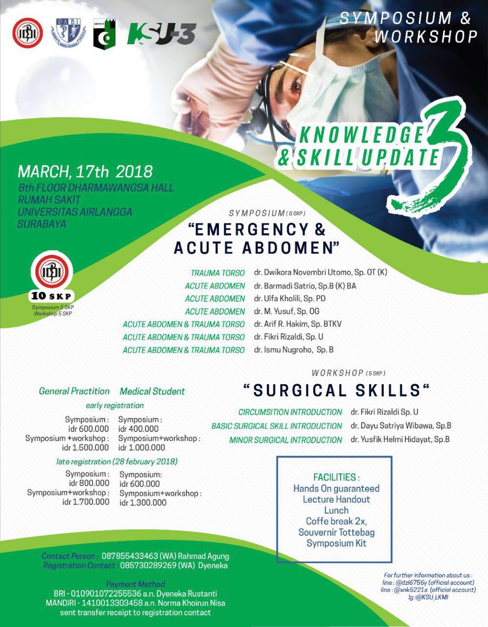 Symposium & Workshop Knowledge and Skill Update 3 kali ini bertemakan "Emergency & Accute Abdomen and Surgical Skills" akan diselenggarakan pada 17 Maret 2018 di RS UNAIR, Surabaya.