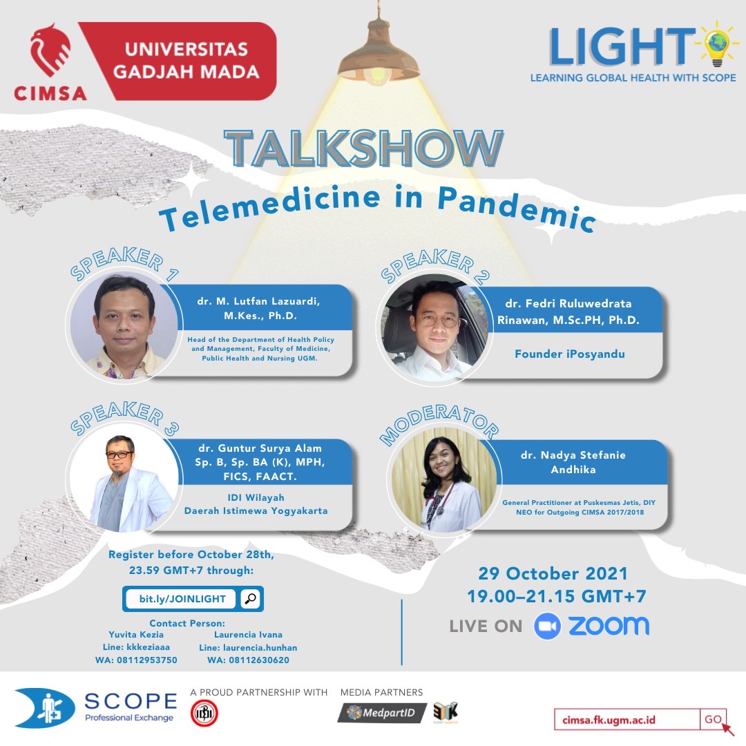 To ensure the optimal usage of telemedicine, SCOPE CIMSA UGM is inviting you to join LIGHT: Learning Global Health with SCOPE. LIGHT will be held in Bahasa Indonesia 🇮🇩 to maximize the information given to you.
