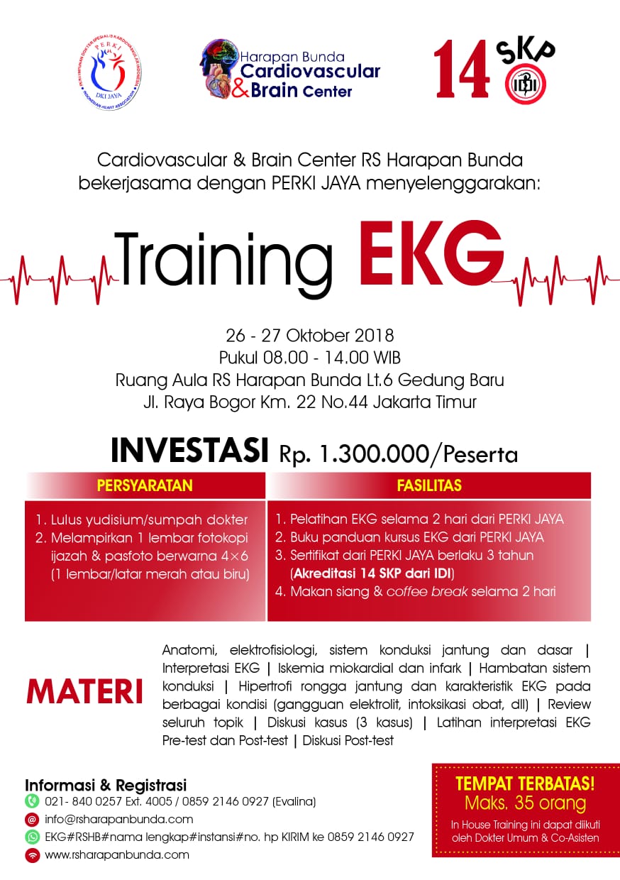 Acara Training EKG ini diadakan oleh RS Harapan Bunda yang bekerjasama dengan PERKIJAYA. Para peserta wajib membayar Rp 1.300.000 dan akan mendapatkan 14 SKP IDI, goodybags, coffee break dan makan siang selama 2 hari..