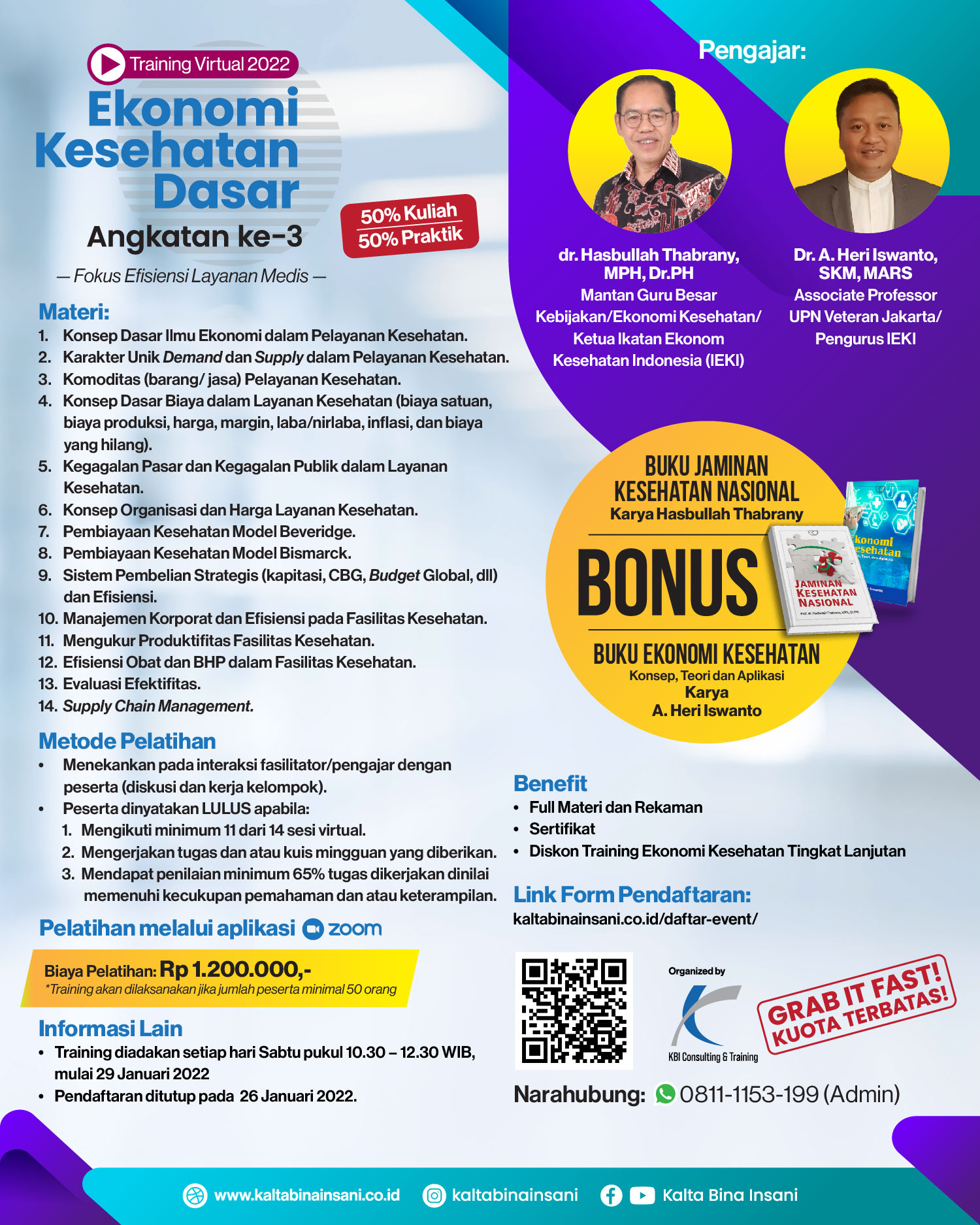 Training ini akan membahas tentang Konsep dasar Ilmu Ekonomi Kesehatan dalam pelayanan kesehatan, Karakter Unik Demand dan Supply dalam Pelayanan Kesehatan, Sistem Pembelian Strategis (kapitasi, CBG, Budget Global, dll), Manajemen Korporat dan Efisiensi pada Fasilitas Kesehatan, dan masih banyak lagi.