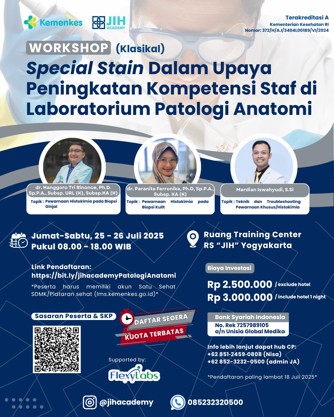 | ATLM, Teknisi Patologi Anatomi, Dokter Spesialis Patologi Anatomi. | 3.000.000 (Earlybird) | 3.000.000 (Reguler) |