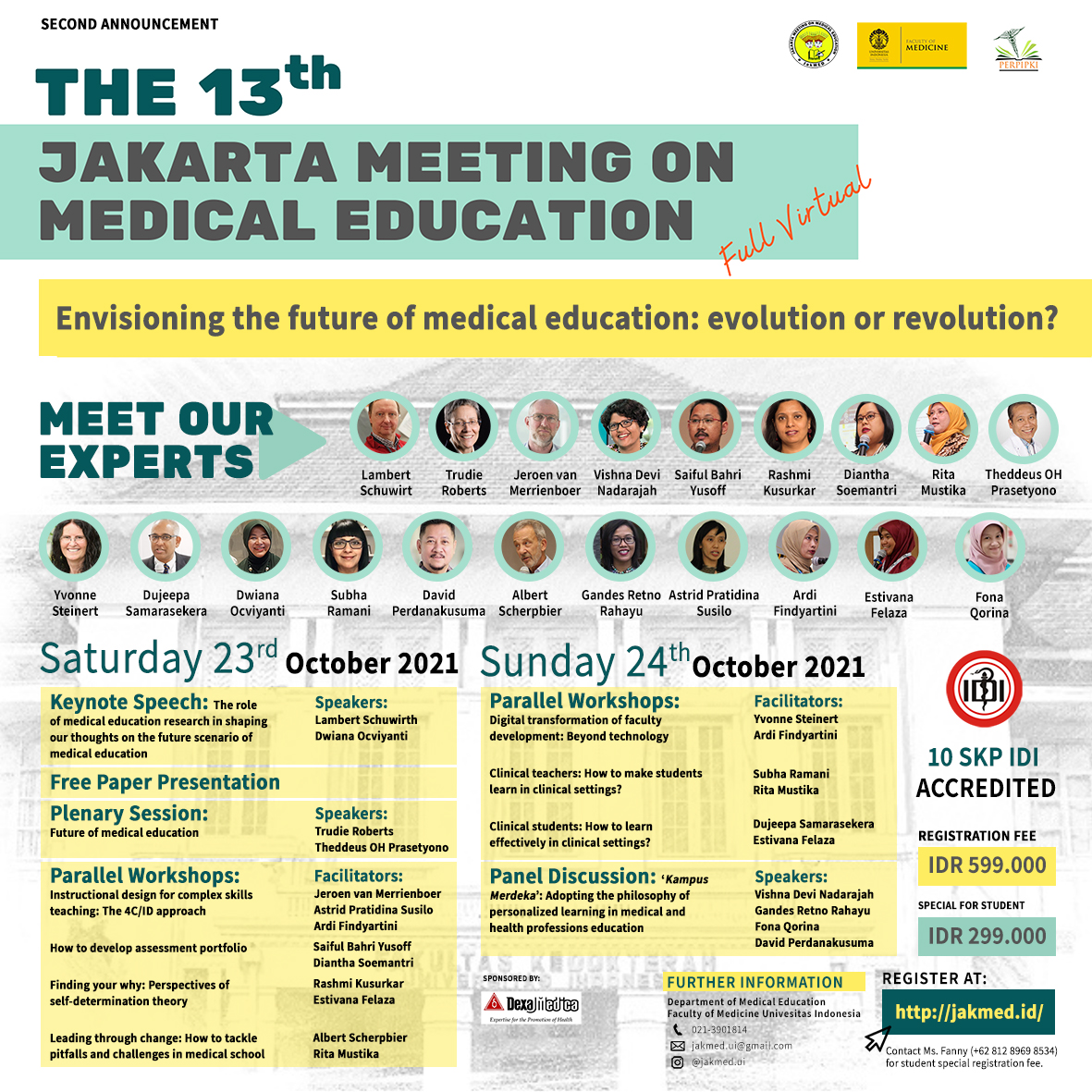 Jakmed is an annual medical education scientific conference held by Department of Medical Education FMUI. Following this uncertain time and situation, let us get together and discuss about the future of medical & health professions education as this year's theme of "Envisioning the future of medical education: Evolution or revolution?"