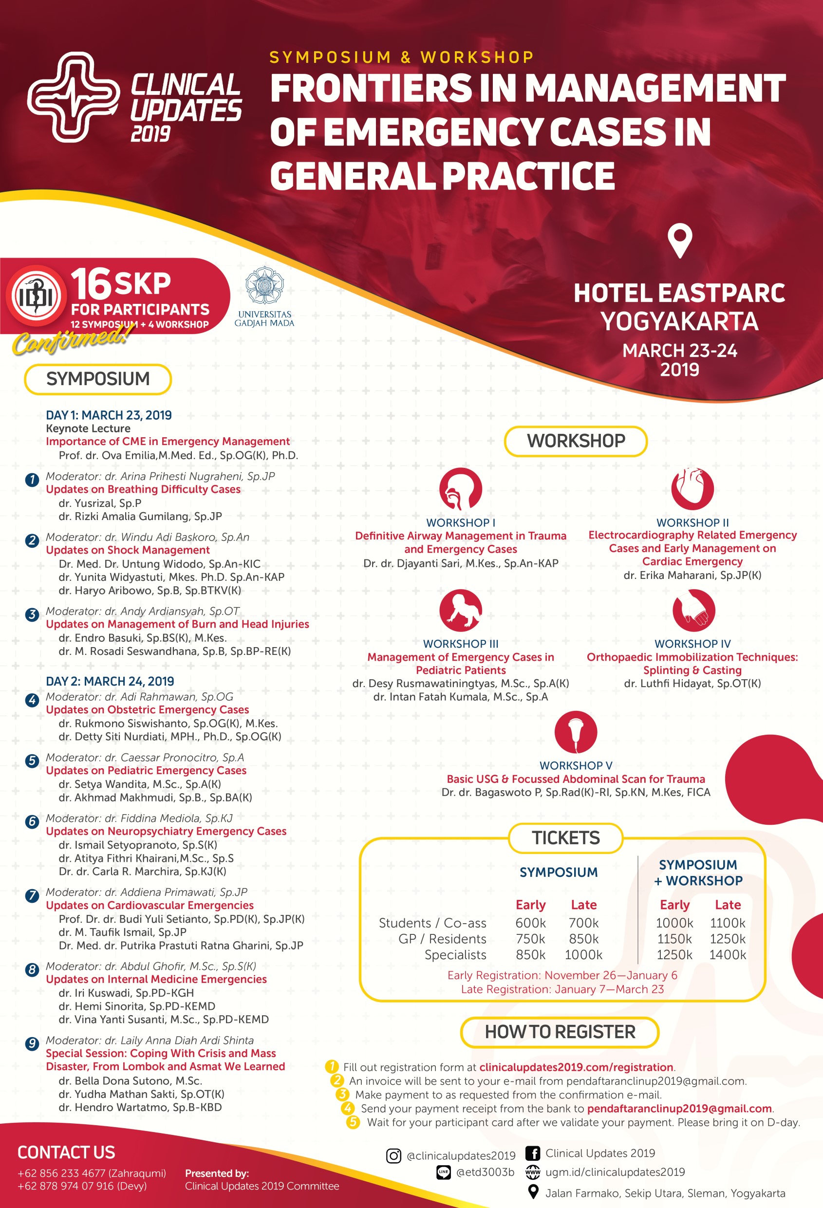 Workshop dan Simposium tahunan yang diselenggarakan oleh Fakultas Kedokteran, Kesehatan Masyarakat dan Keperawatan (FKKMK) UGM, Clinical Updates 2019 akan membawakan tema Frontiers In Management of Emergency Cases in General Practice yang terdiri dari 9 tema Simposium dan 5 tema workshop, dengan SKP peserta 16 SKP. Acara ini akan diselenggarakan pada: