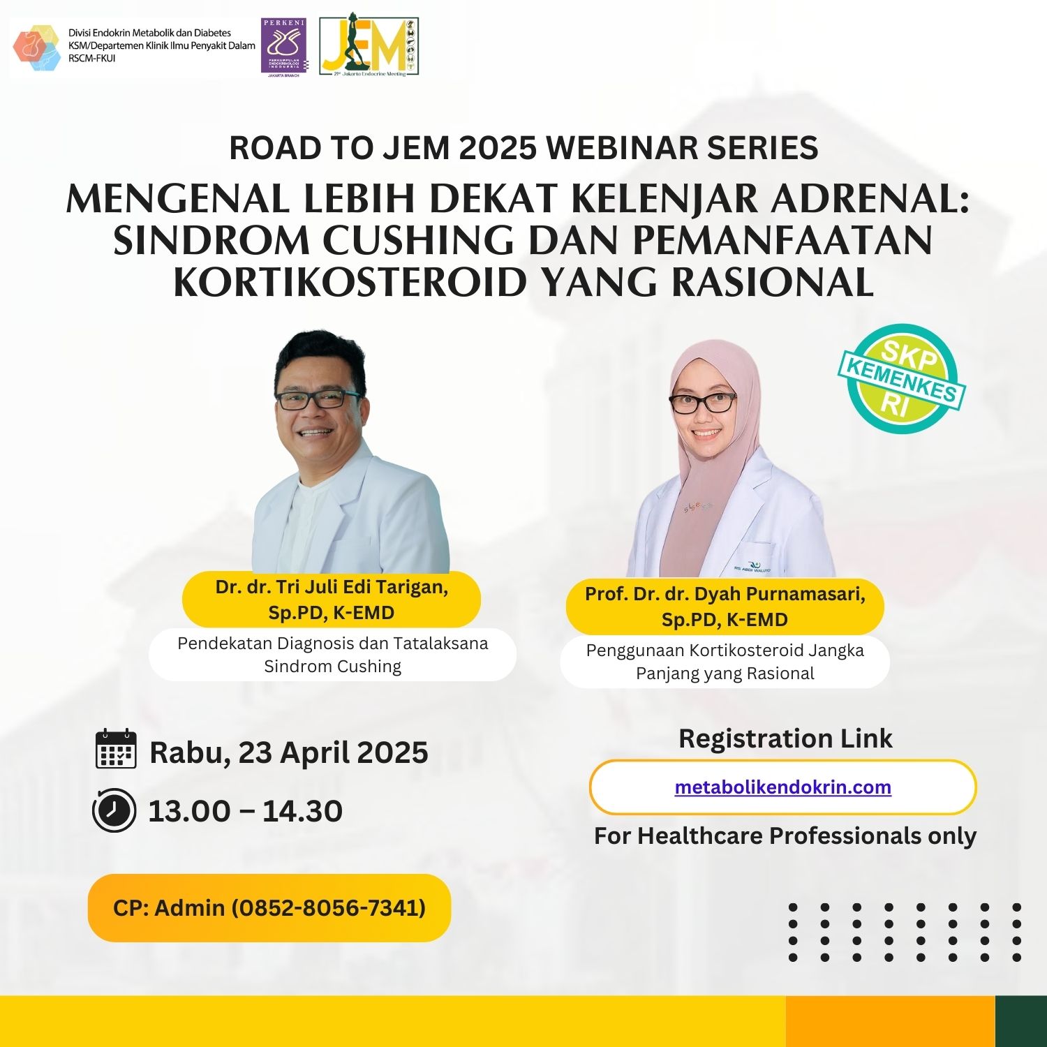 Webinar ini ditujukan bagi tenaga medis, mahasiswa kedokteran, serta masyarakat umum yang ingin memperdalam pemahaman mengenai gangguan adrenal dan terapi kortikosteroid yang rasional. Jangan lewatkan kesempatan untuk belajar langsung dari para ahli endokrinologi!