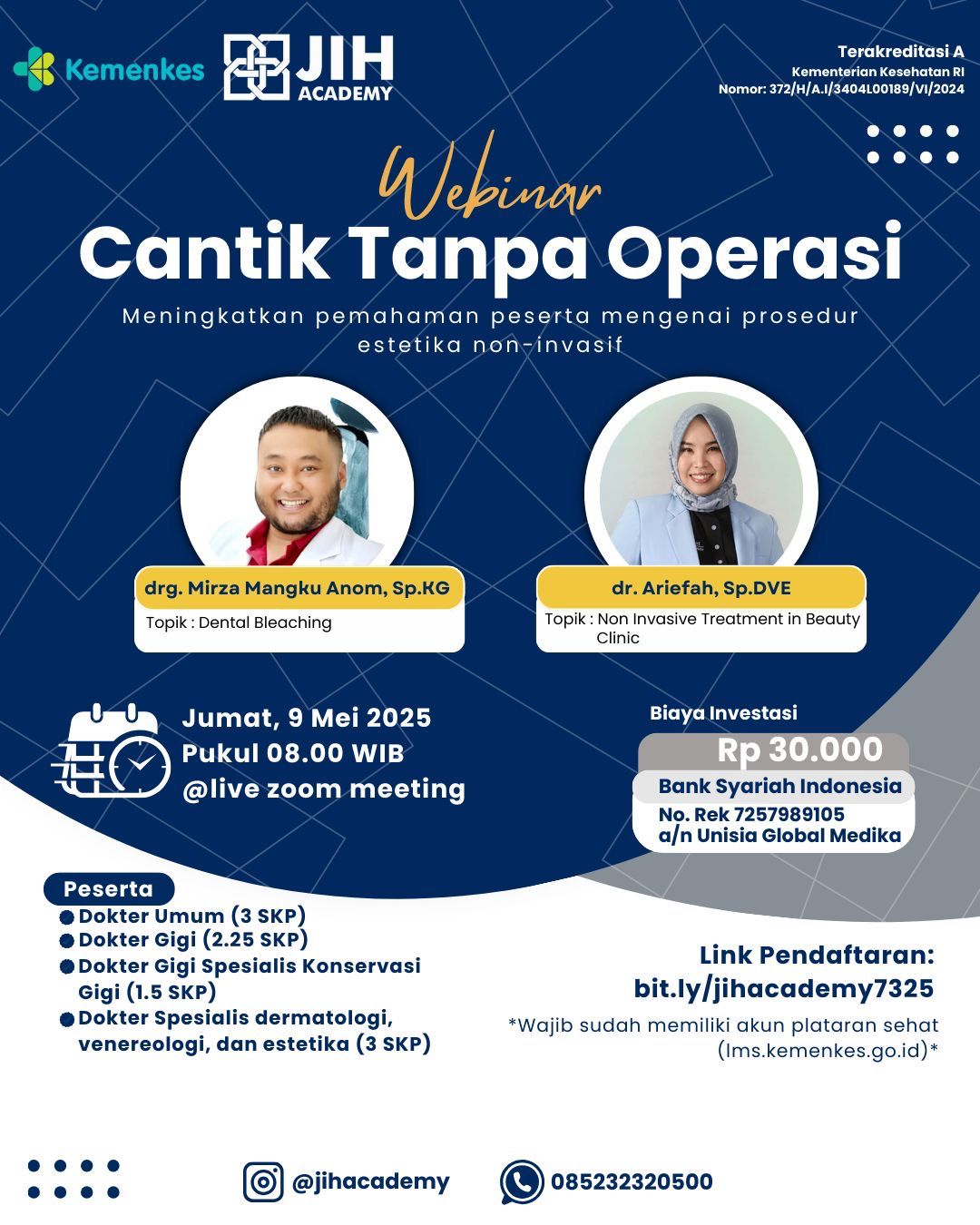 Tentu bisa dong! kita ada Webinar ber-SKP Kemenkes RI lho dengan judul ✨“Cantik Tanpa Operasi” Meningkatkan pemahaman peserta mengenai prosedur estetika non-invasif Pendekatan Terkini untuk Praktisi Medis✨