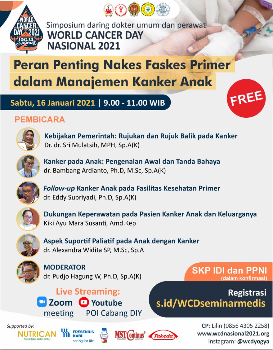 dalam rangka memperingati Hari Kanker Sedunia yang jatuh pada tanggal 4 Februari 2021, kami selaku panitia yang mewakili Perhimpunan Onkologi Indonesia Cabang DIY, Yayasan Kanker Indonesia Cabang DIY dan RSUP Dr Sardjito Yogyakarta mengundang Bapak/Ibu/Saudara dalam Simposium daring dokter dan perawat, yang merupakan rangkaian acara WCD Yogyakarta-Nasional, dengan topik: