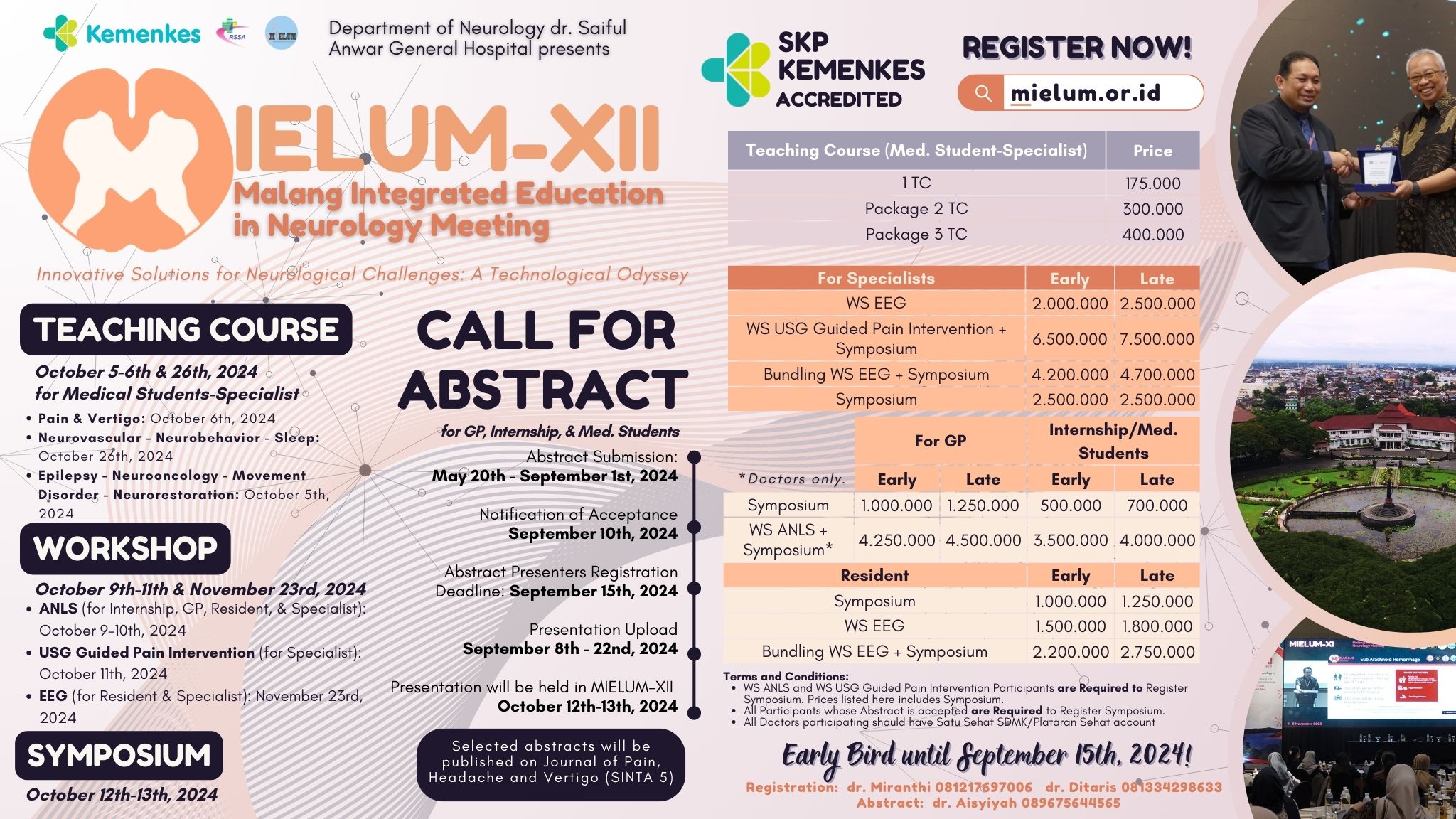| Workshop EEG + Symposium - Spesialis | 4.200.000 (Earlybird) | 4.700.000 (Reguler) |