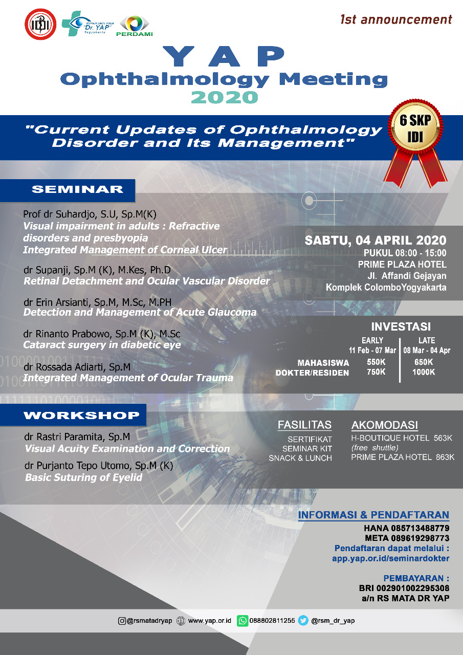 RS Mata "Dr.YAP" dengan bangga mempersembahkan YAP Opthalmology Meeting 2020 dengan Tema "Current Updates of Ophthalmology Disorder and Its Management", yang akan dilaksanakan pada: