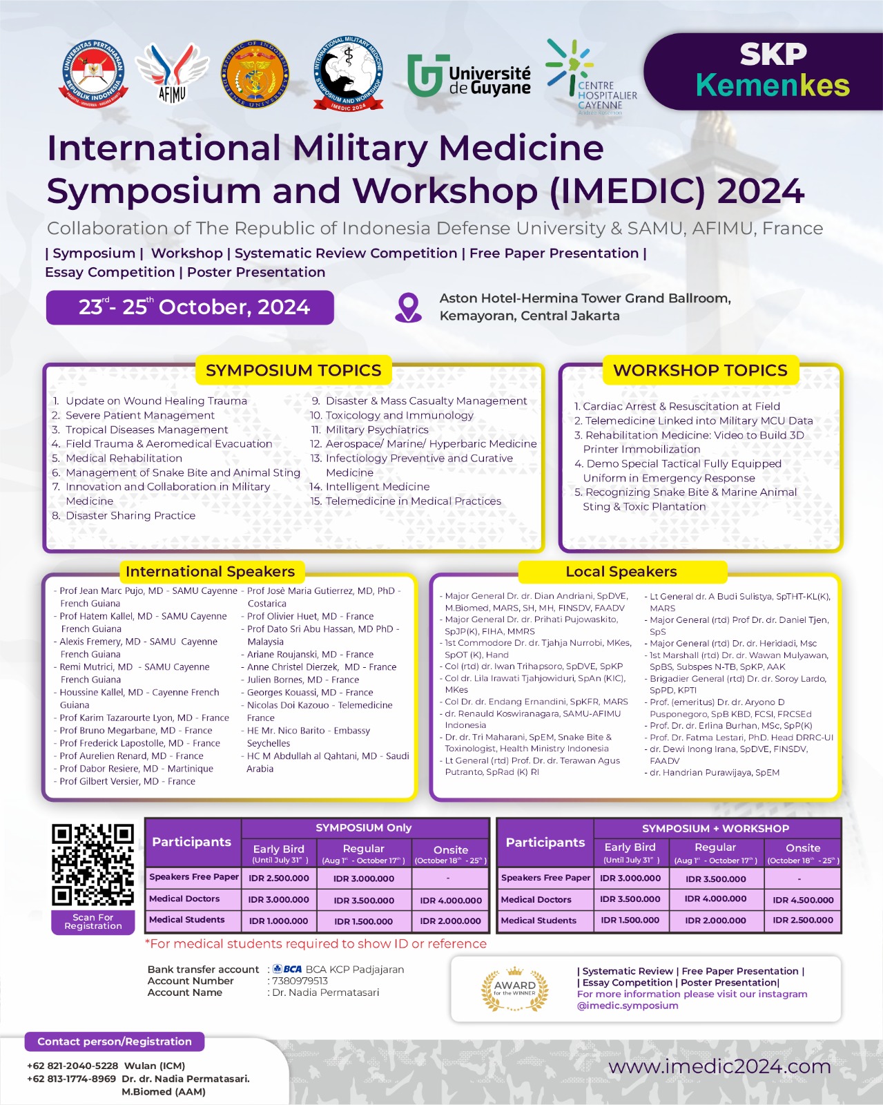 Yang kami hormati para praktisi kedokteran dan kesehatan, kami mengundang kehadirannya pada Simposium dan Workshop Internasional yang diselenggarakan oleh Fakultas Kedokteran Militer Unhan RI🇮🇩 bekerjasama dengan AFIMU, Universite de Guyane, France🇫🇷