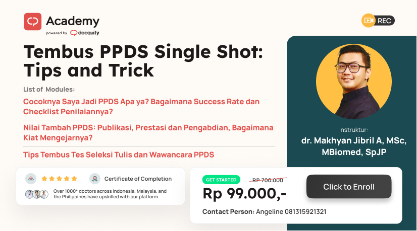 Docquity Academy mengundang Anda mengikuti "Tembus PPDS Single Shot: Tips and Trik". Kelas ini disajikan berupa video materi dimana peserta bisa langsung mengakses kelasnya setelah melakukan registrasi.