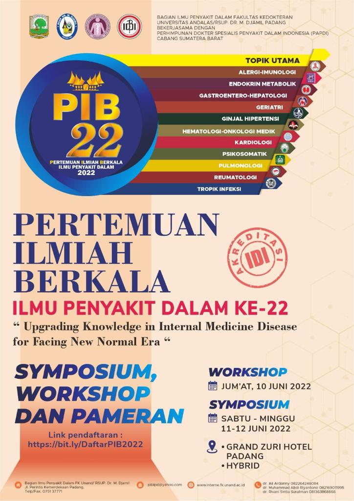 Bagian Ilmu Penyakit Dalam Fakultas Kedokteran Universitas Andalas / RSUP DR.M.Djamil Padang bekerja sama dengan Perhimpunan Dokter Spesialis Penyakit Dalam Indonesia (PAPDI) Cabang Sumatera Barat mengundang Sejawat untuk mengikuti Simposium & Workshop yang akan dilaksanakan secara hybrid, dengan tema “Upgrading Knowledge in Internal Medicine Disease for Facing New Normal Era” pada: