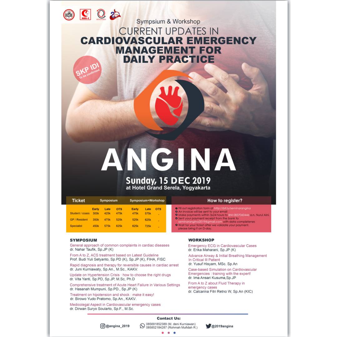 ANGINA : "Current Updates in Cardiovascular Emergency Management for Daily Practice" will be held on December 15th, 2019 in Grand Serela Hotel, Yogyakarta