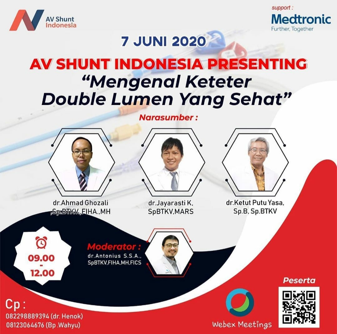Kegiatan ini diselenggarakan oleh AV-Shunt Indonesia yang bekerja sama dengan PT Medtronic Indonesia, dalam Webinar Series ini akan dilaksanakan secara berkelanjutan. Tema yang akan didiskusikan pada sesi ini adalah "Bagaimana mengindikasi kateter yang sesuai dengan standard untuk kebutuhan Hemodialisa".