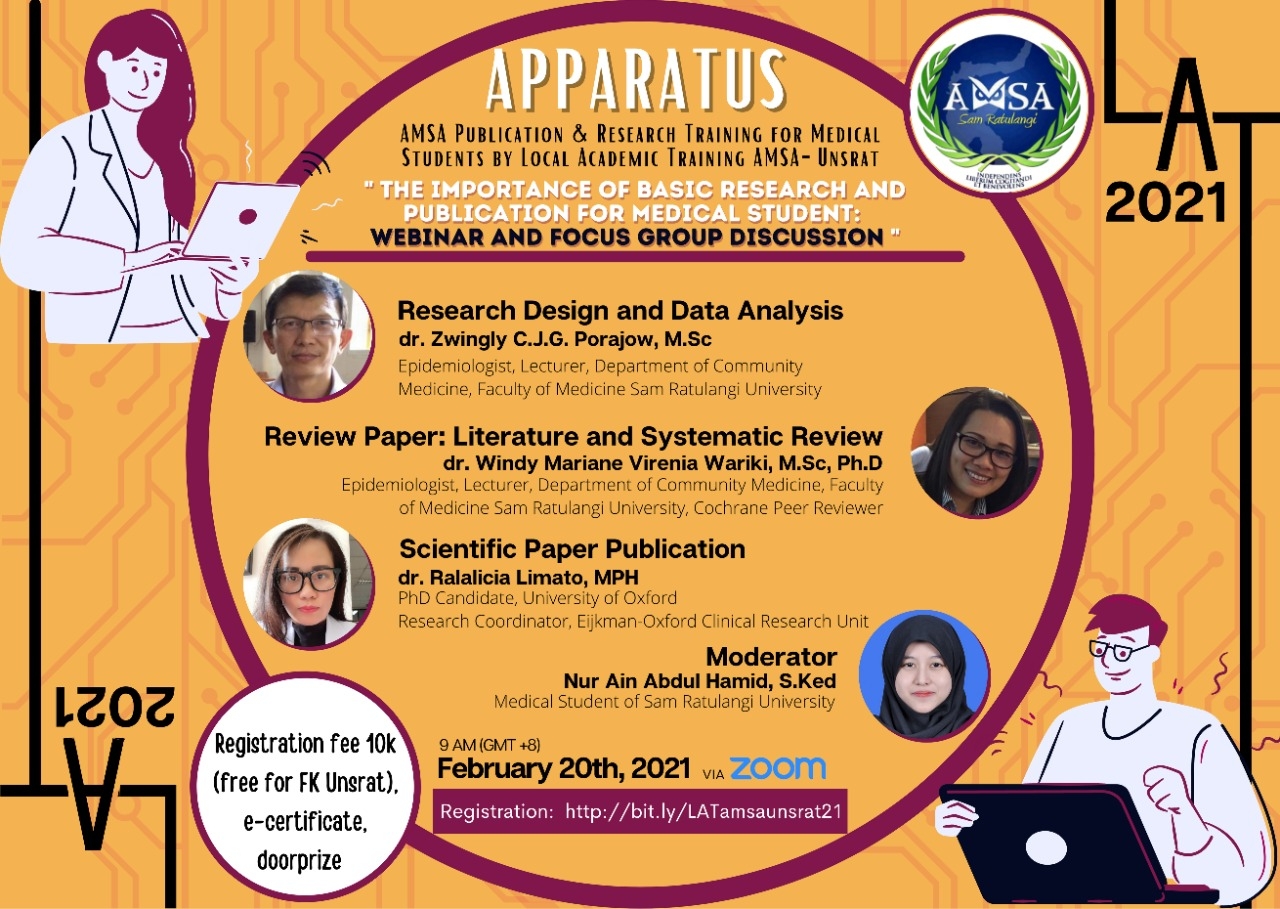 👩🏻⚕️ As medical students, despite the need to maintain good grades in medical school, we need to develop writing and publishing skills as both are essential to be understood as future physicians. Therefore, AMSA-Unsrat tenure 2020/2021 proudly presents a program entitled Local Academic Training: Apparatus (AMSA Publication and Research Training for Medical Students) that aims to develop the essential knowledge and skill of participants that will help establish their future in medical career. This event will hold a Webinar and Focus Group Discussion (FGD).