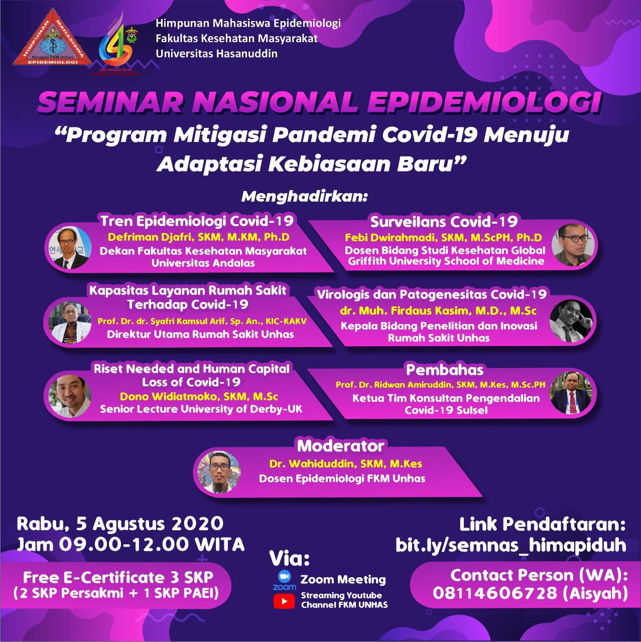 SEMINAR NASIONAL EPIDEMIOLOGI dengan Tema "Program Mitigasi Pandemi Covid-19 Menuju Adaptasi Kebiasaan Baru"