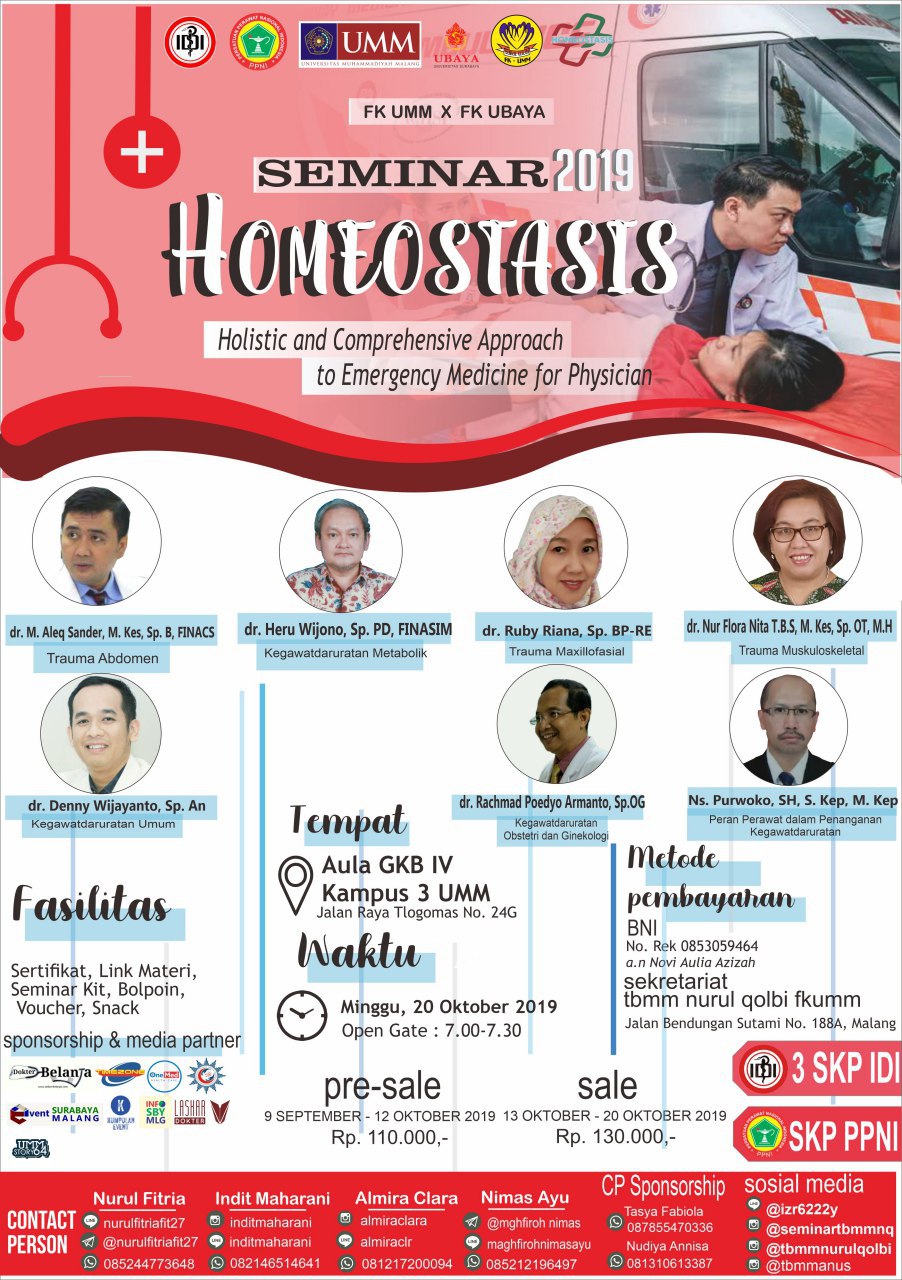 Seminar kami bernama HOMEOSTASIS 2019, diadakan di Malang dengan 7 pembicara. Topik dari seminar kami ada trauma abdomen, trauma muskuloskeletal, trauma maxillofacial, kegawatdaruratan metabolik, kegawatdaruratan umum, kegawatdaruratan obgyn serta peran perawat dalam kegawatdaruratan.