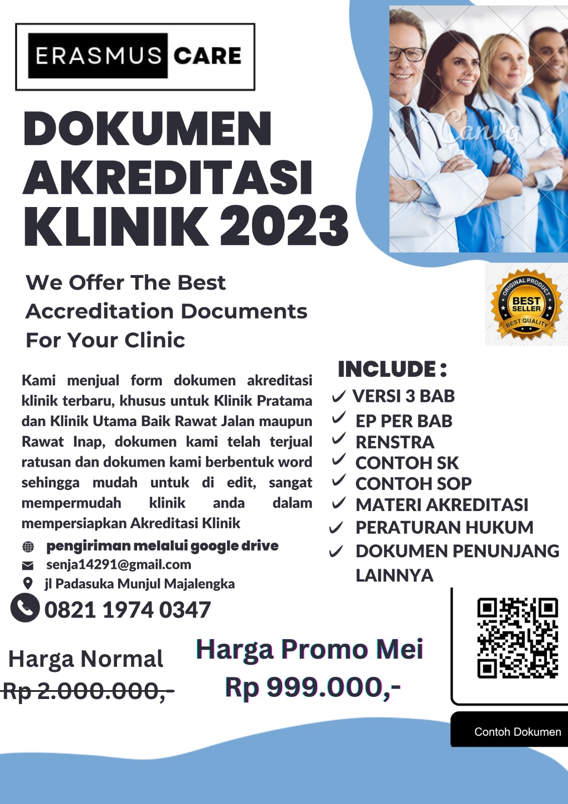 FLASHSALE Promo Mei, Dear Bapak/Ibu Dokter Perawat dan Rekan Sejawat, Mohon Maaf Sebelumnya Kami bermaksud menawarkan Form Dokumen Persiapan Akreditasi Klinik 2023, Form dokumennya sangat lengkap terdiri dari 3 Bab dan semua elemen penilaiannya, juga Form dokumen sudah dilengkap dengan Renstra, Contoh Profil Klinik dan RUK dan lain lain, dan File dalam bentuk Doc Word sehingga bisa diedit, dan Bonus Materi Seminar Akreditasi Klinik