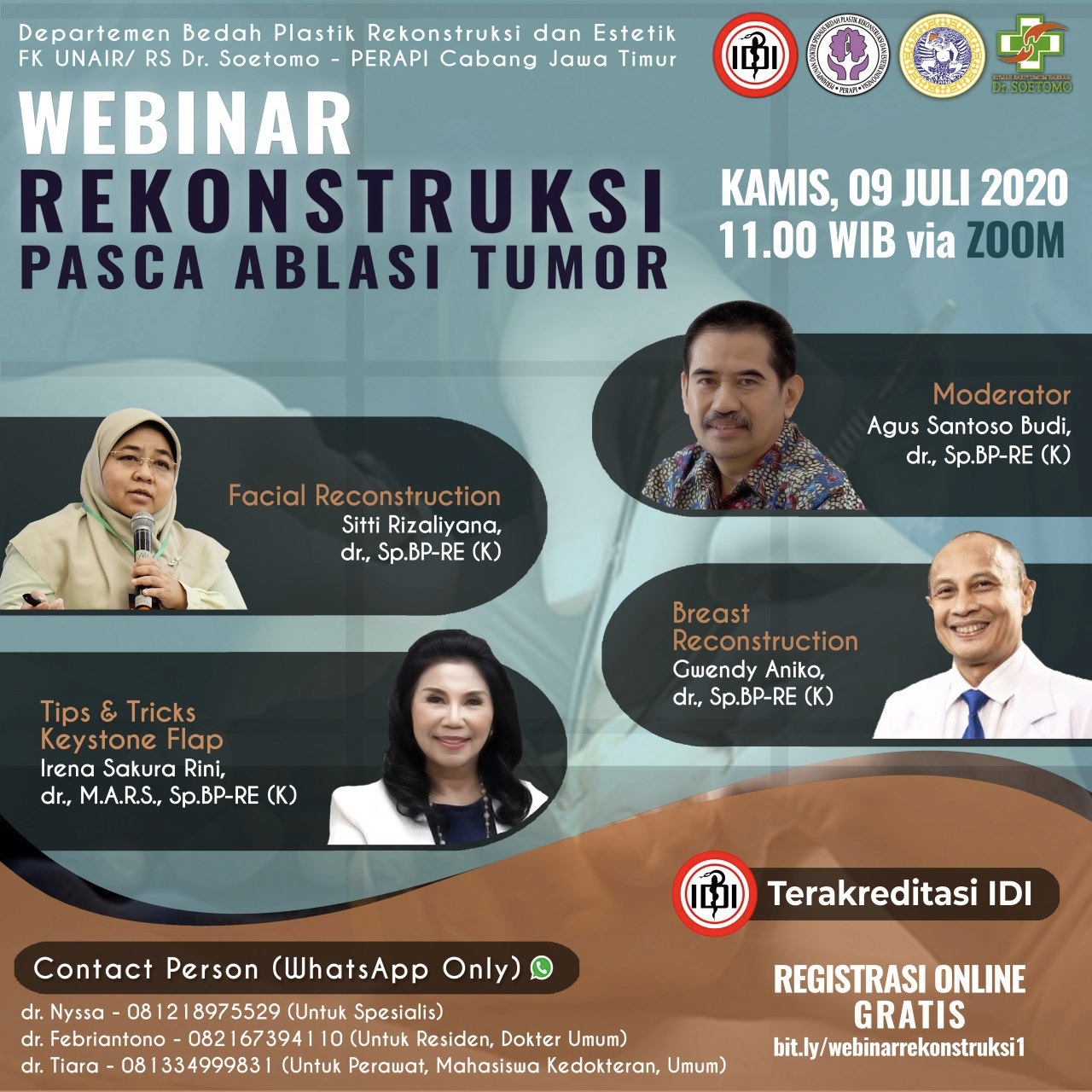 Departemen Bedah Plastik Rekonstruksi dan Estetik, Fakultas Kedokteran Universitas Airlangga, RS Dr. Soetomo bekerja sama dengan PERAPI (Perhimpunan Dokter Spesialis Bedah Plastik Rekonstruksi dan Estetik Indonesia) Cabang Jawa Timur menghadirkan: