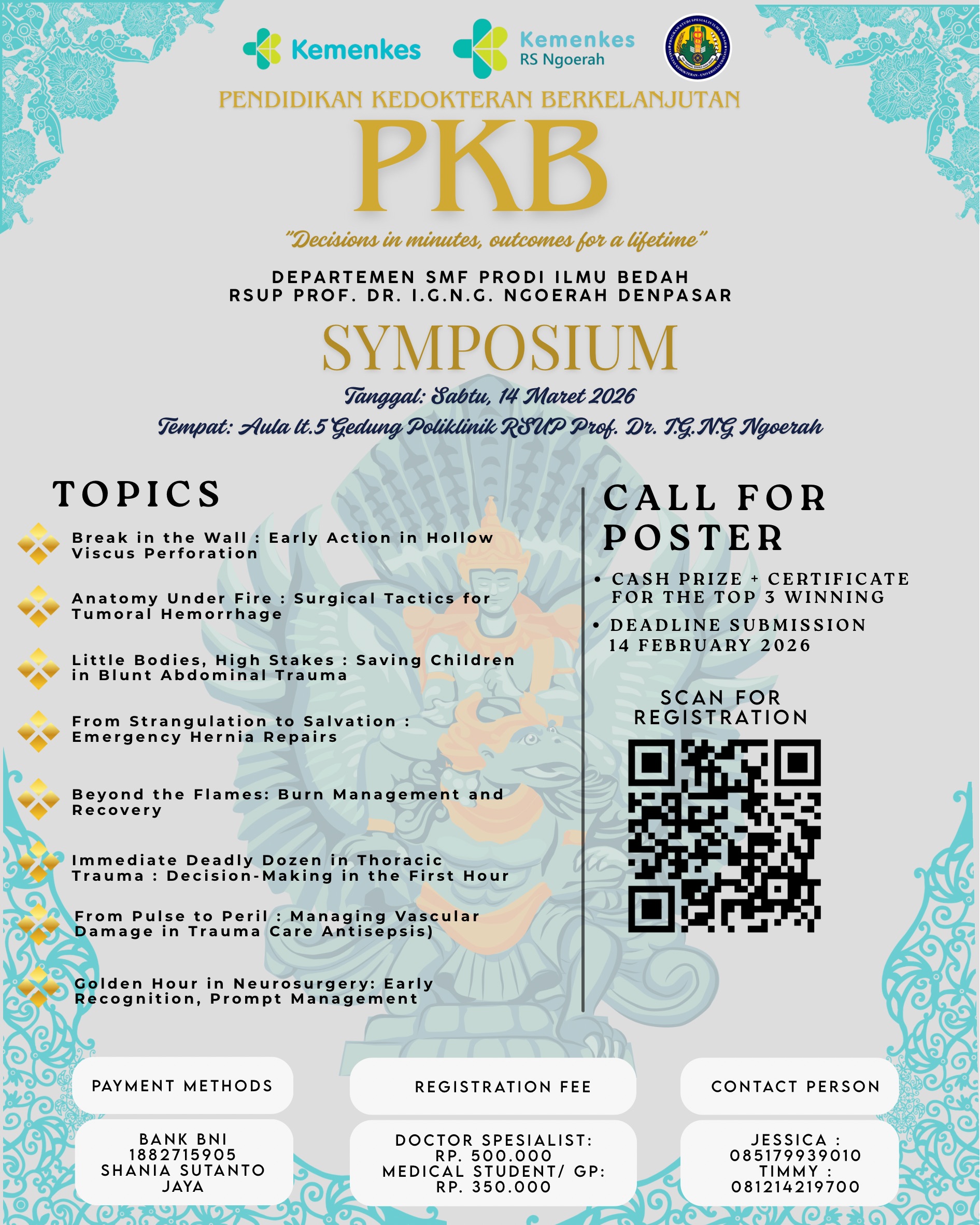 mengundang sejawat untuk mengikuti Symposium PKB Bedah yang membahas pengambilan keputusan cepat dan tepat dalam kasus bedah kritis.