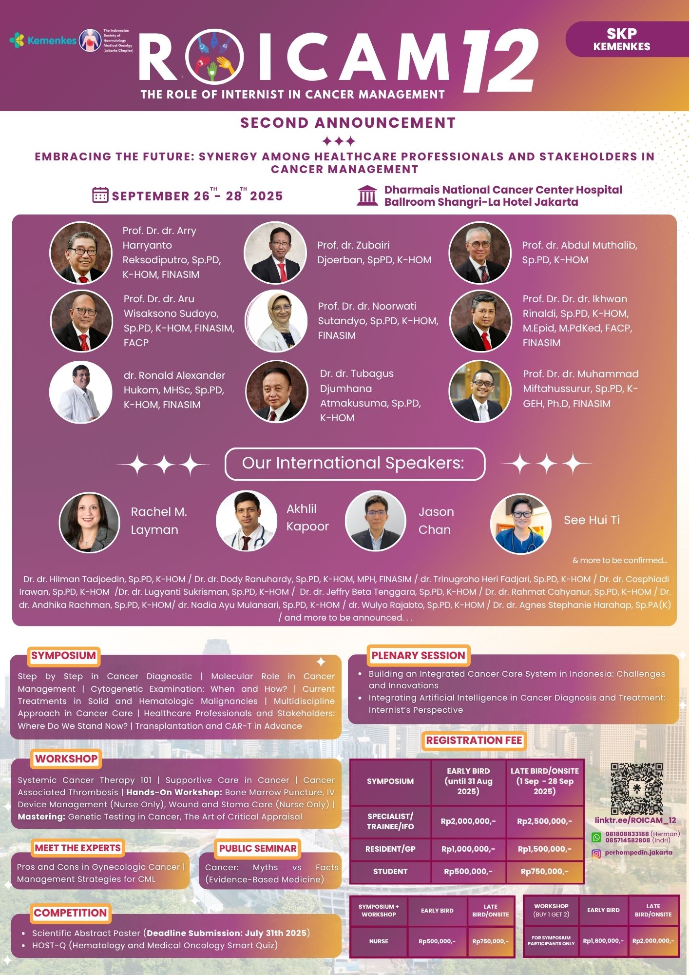 Get ready for ROICAM 12 - The Role of Internist in Cancer Management - 2025! This prestigious event will take place on September 26-28, 2025, at Dharmais National Cancer Center Hospital and Shangri-La Hotel Jakarta.