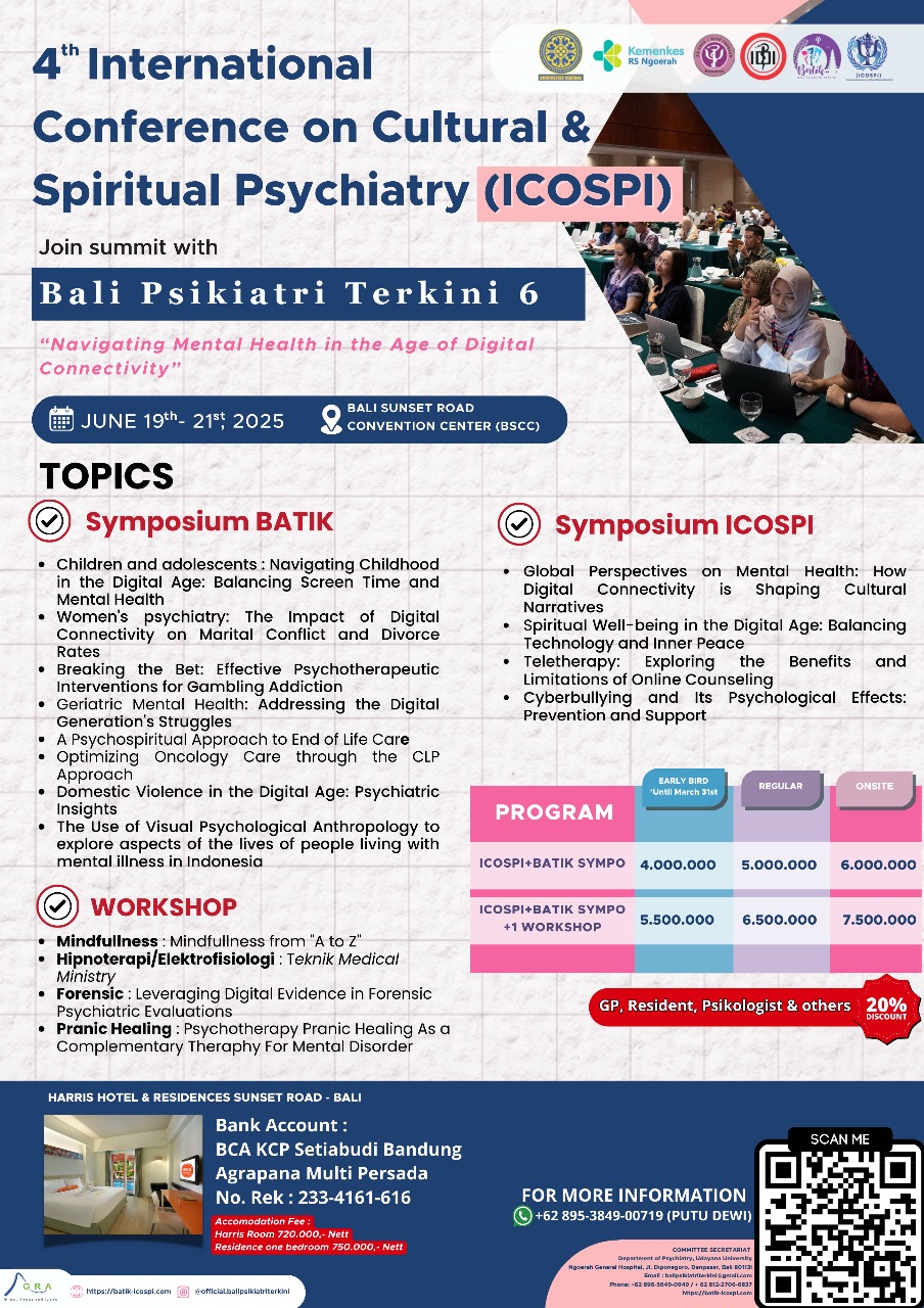 Join 4th International Conference on Cultural & Spiritual Psychiatry (ICOSPI) Join Summit with Bali Psikiatri Terkini 6 (BATIK 6)