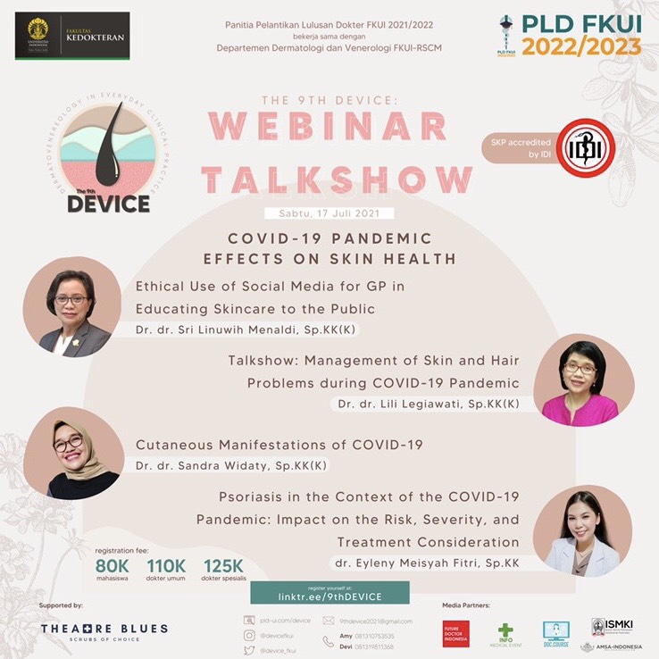A year has passed since the World Health Organization (WHO) declared the outbreak of Coronavirus Disease-19 (COVID-19) as a world pandemic. A great deal of research and findings has been published since, as one of them were findings regarding COVID-19 Pandemic and Dermatology Issues. On 17th July 2021, The 9th Dermatovenereology in Everyday Clinical Practice (DEVICE) will be bringing you the Pre-Event 1: COVID-19 Pandemic Effects on Skin Health Webinar, to give medical students and doctors, the updates on the topics of COVID-19 infection & autoimmune disease, and ethical & cosmetic dermatology related issues in COVID-19 Pandemic. Participants will be given certificate with IDI SKP after the event.