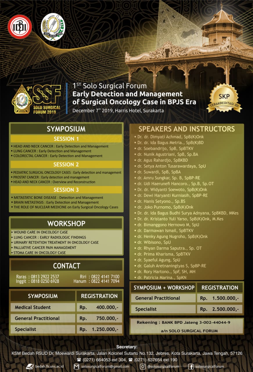 It’s a pleasure for us the Indonesian Association of Surgeon, to invite you to the 1st Solo Surgical Forum. This event is going to be held at Harris Hotel Surakarta on 7 December 2019. Holding up a theme "The Early Detection and Management of Surgical Oncology Case in BPJS Era", we are honored to bring you the highly respected, multidisciplinary nation and local speaker from leading expert to the Surakarta field, besides, another famous thing from Solo is it’s lying across in fertile plain terrain along the longest river in Java, Bengawan Solo River. Flanked by mountain volcanoes Merapi and Merbabu in the north, and mount Lawu in the southeast border, it’s as famous as a stronghold and center of Javanese culture and tradition.