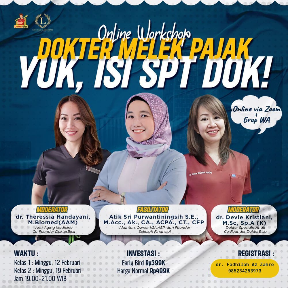 Buat teman sejawat dokter yang masih bingung atau butuh pendampingan dalam mengisi SPT Pajak, yuk bergabung di kelas online workshop pajak dokter yang diadakan oleh DokterBisa Academy: