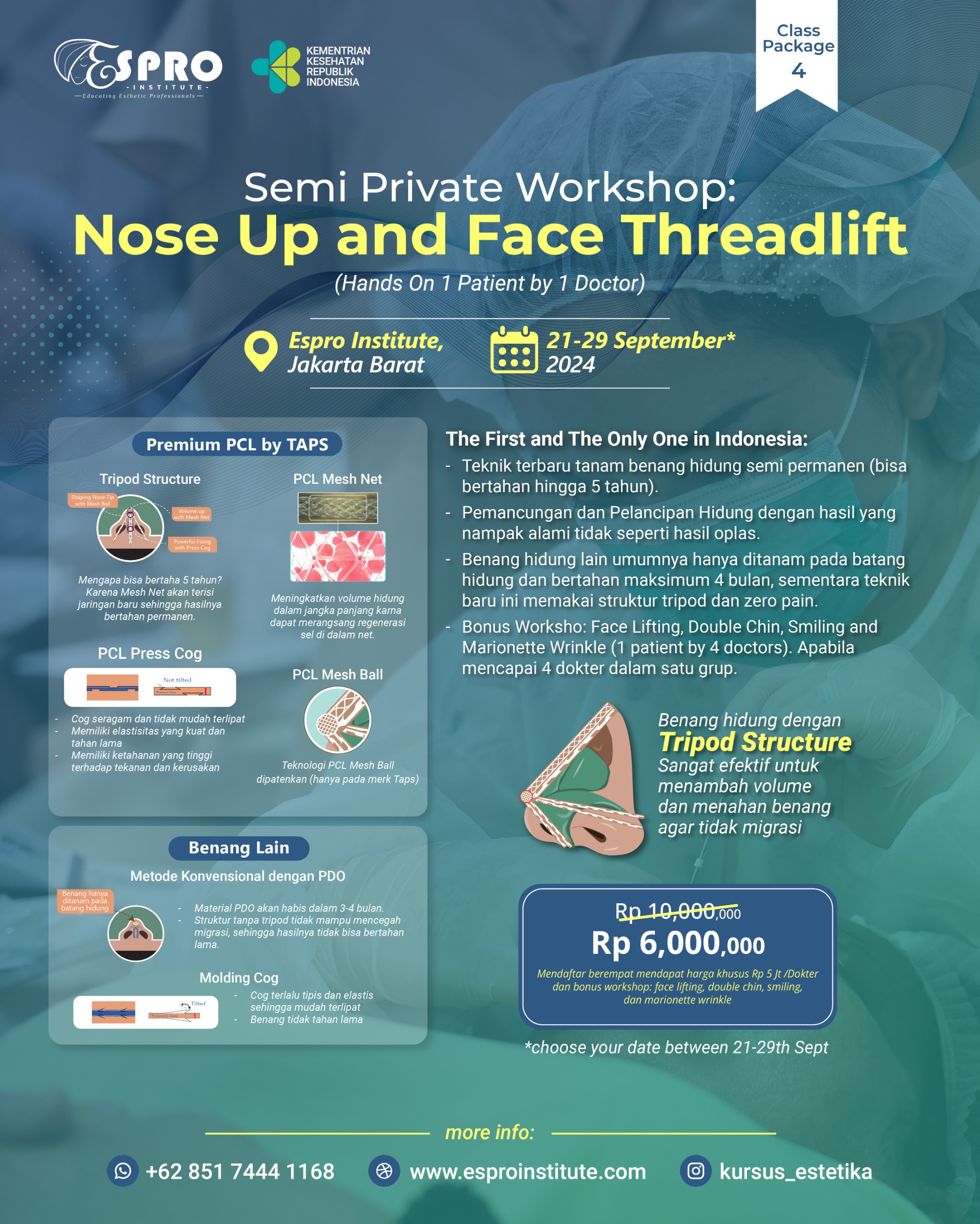 Mendaftar berempat mendapat harga khusus Rp 5jt/Dokter dan bonus workshop (face lifting, double chin, smiling, dan marionette wrinkle).