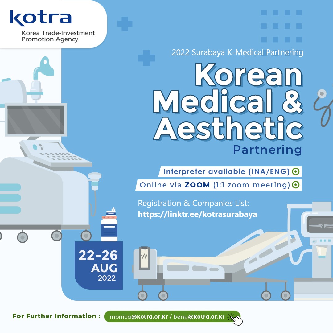 KOTRA Surabaya selaku kantor perwakilan dagang pemerintah Korea mengundang Bapak dan Ibu sekalian ke dalam event "Korean Medical & Aesthetic Partnering" yang akan berlangsung secara online pada tanggal 22 – 26 Agustus 2022.