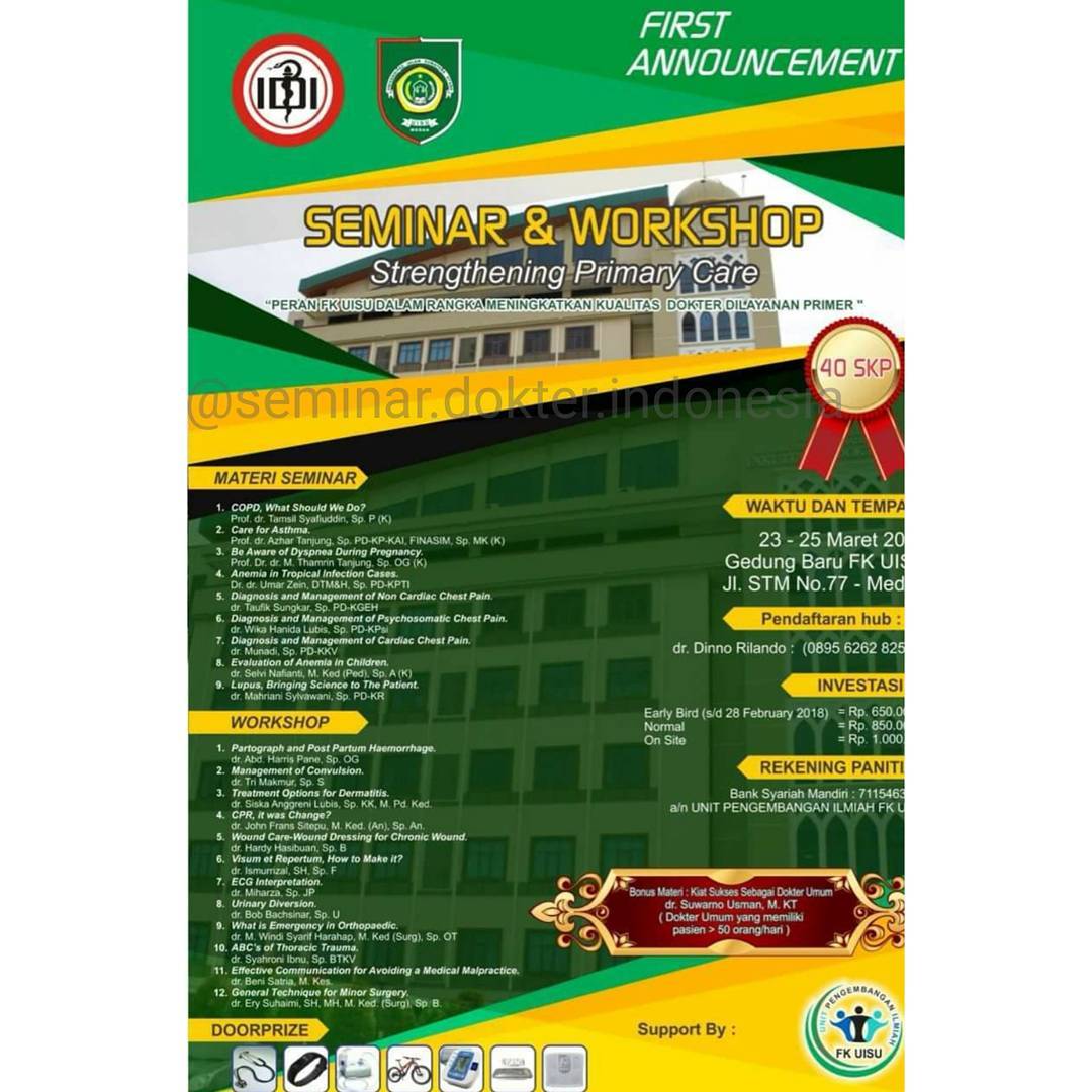 Seminar & Workshop Strengthening Primary Care dengan tema Peran FK UISU dalam Rangka Meningkatkan Kualitas Dokter di Layanan Primer akan dilaksanaka di Gedung baru FK UISU pada tanggal 23-25 Maret 2018.