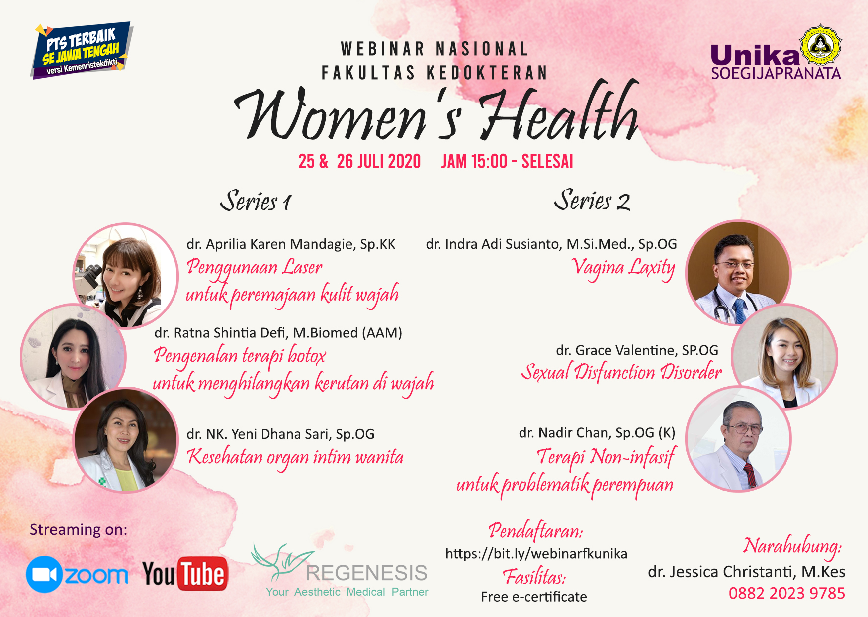 Dalam webinar ini, kami FAKULTAS KEDOKTERAN UNIKA SOEGIJAPRANATA bekerjasama dengan PT Regenesis Indonesia akan menampilkan 6 narasumber yang telah memiliki reputasi dalam bidang keahlian kesehatan wanita baik di level nasional maupun internasional.