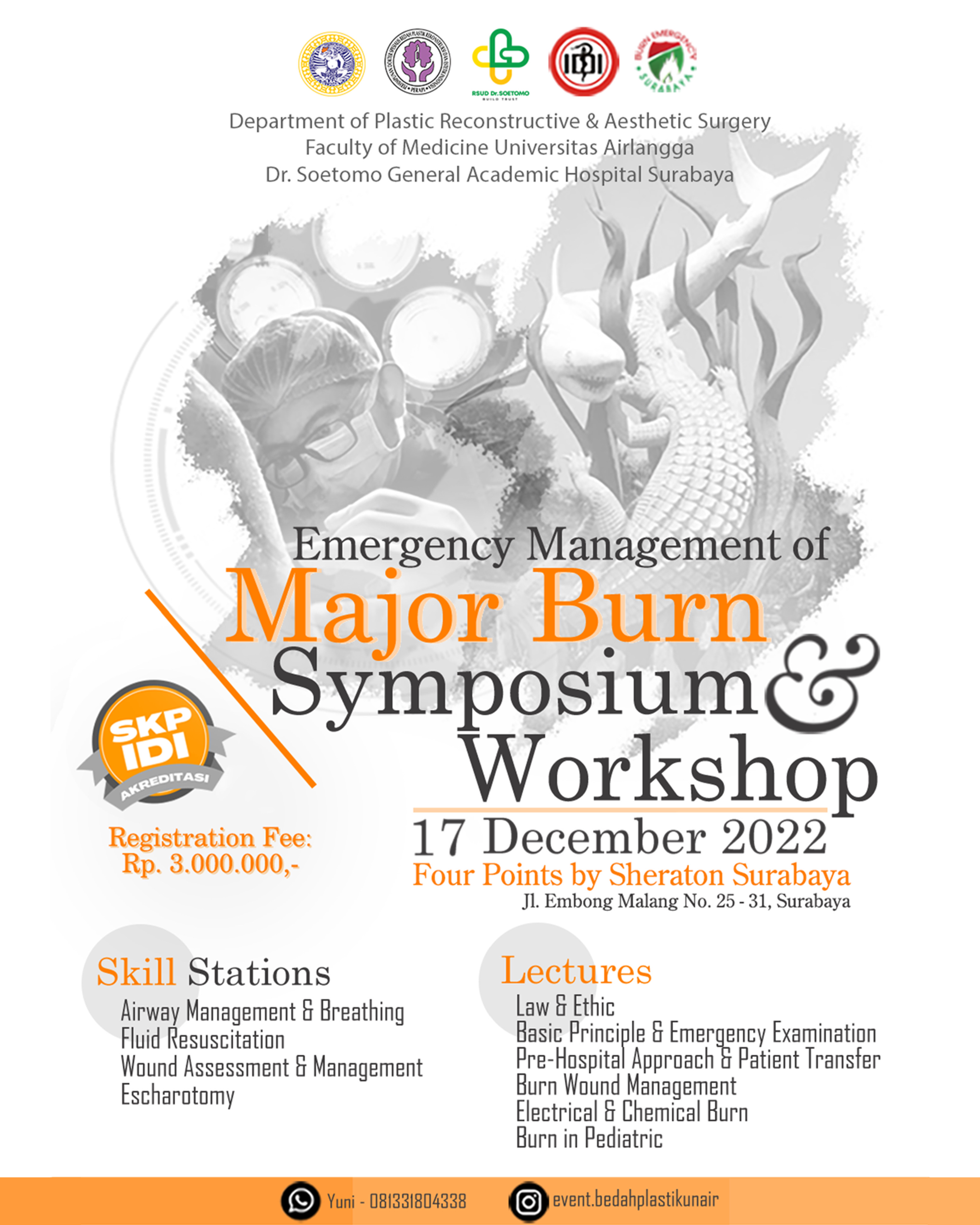 Dept/KSM Bedah Plastik Rekonstruksi & Estetik FK UNAIR/RSUD Dr. Soetomo in cooperation with PERAPI Jatim proudly presents Emergency Management of Major Burn, Symposium and Worrkshop will be held in December 17th 2022