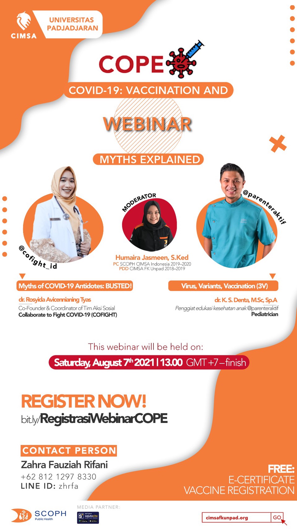Untuk meningkatkan pemahaman tentang vaksin dan pentingnya melakukan vaksinasi, SCOPH CIMSA FK Unpad akan menyelenggarakan webinar dengan judul “COVID-19 Vaccine and Productivity in Pandemic Era”.