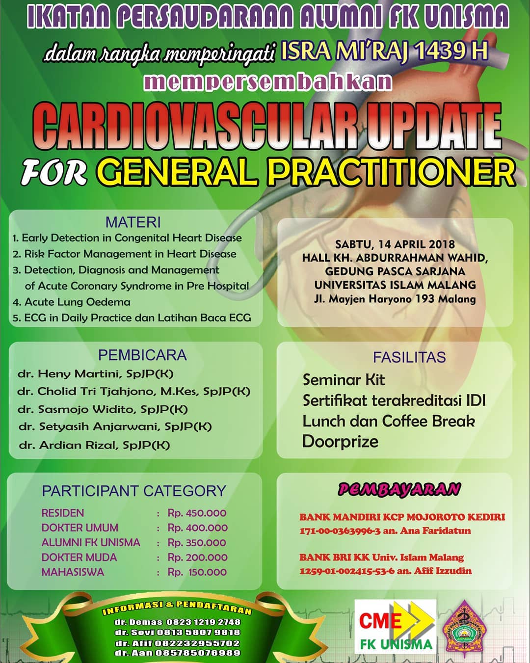 CARDIOVASCULAR UPDATE FOR GENERAL PRACTITIONER 📝 Sabtu, 14 april 2018 🏣 Hall KH. Abdurrahman Wahid, Gedung Pasca Sarjana Universitas Islam Malang.