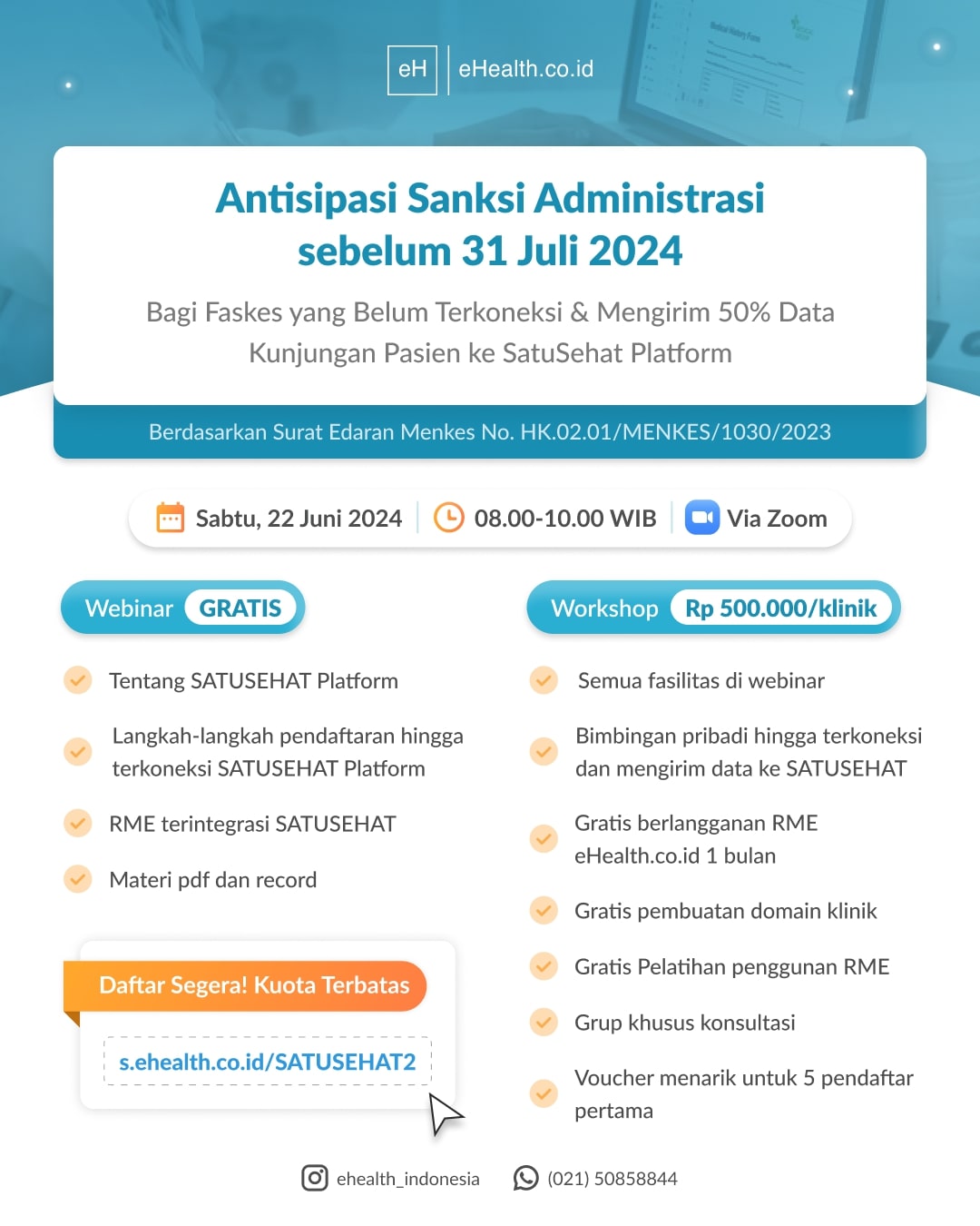 Ikuti Webinar & Workshop Antisipasi Sanksi Administrasi, faskes harus mengirimkan setidaknya 50% data kunjungan ke SATUSEHAT Platform sebelum 31 Juli 2024. Mengingat proses hingga terkoneksi dan mengirim data membutuhkan waktu, maka event ini akan diselenggarakan pada: